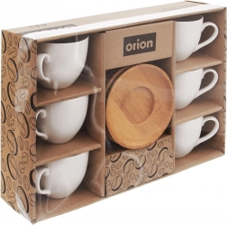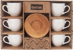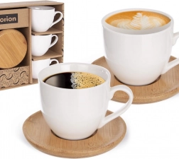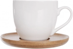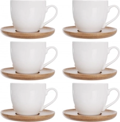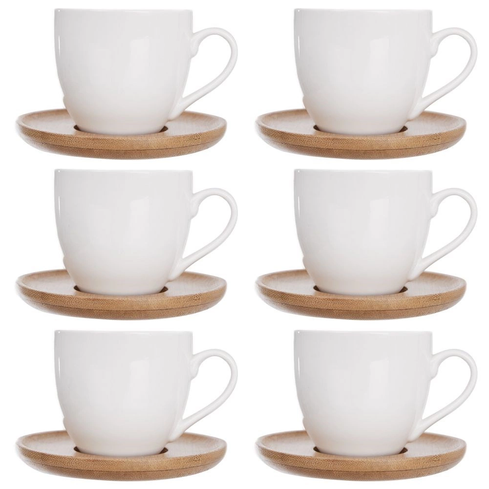 Elegante set van zes porseleinen kopjes met bamboe schoteltjes voor stijlvolle espressoserveer. Minimalistisch design, hoogwaardig porselein en praktische bamboe schoteltjes die het oppervlak beschermen. De kopjes hebben een inhoud van 100 ml, een comfortabel ergonomisch oor en kunnen in de vaatwasser (zonder schoteltjes) worden gereinigd.