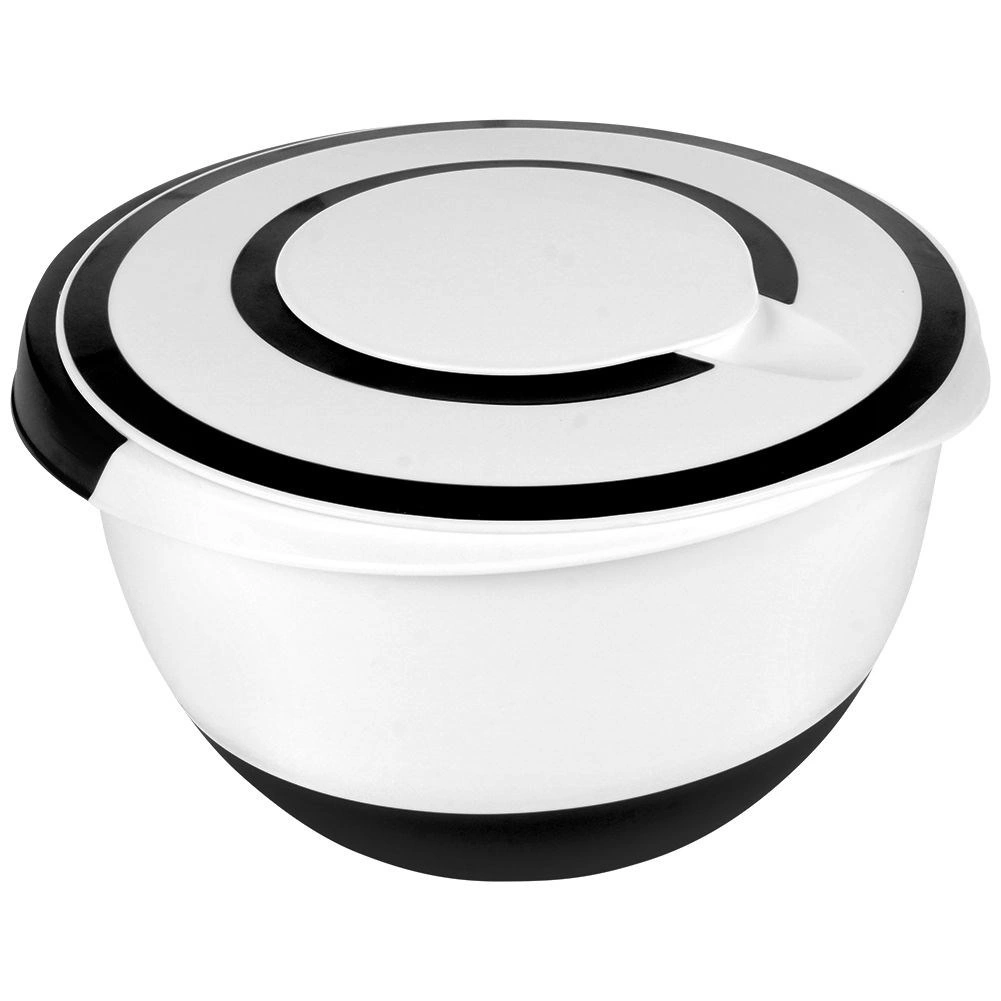 Praktische keukenkom met tweedelig deksel van 5 l voor comfortabel roeren, kloppen en mixen zonder spatten. Duurzame uitvoering, antislipbodem, schenktuit en vaatwasserbestendig voor eenvoudig dagelijks koken.
