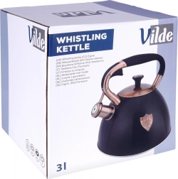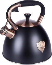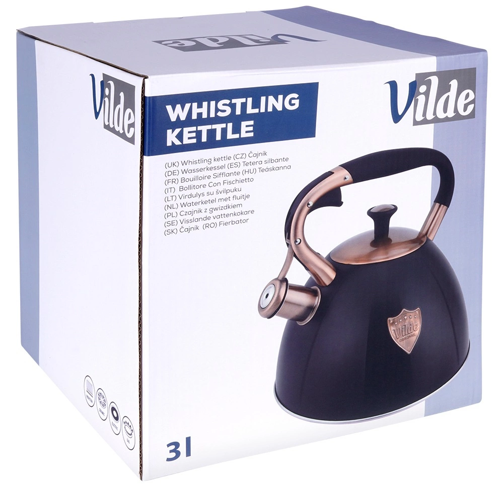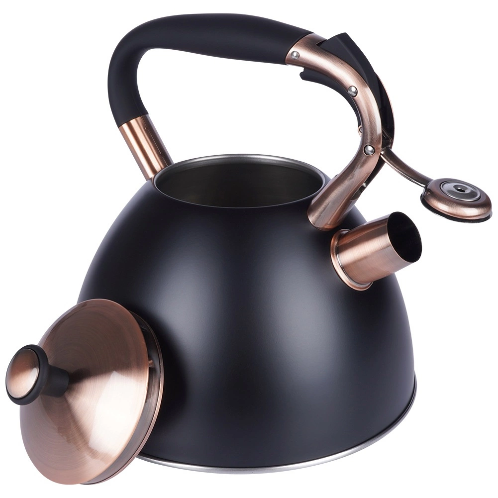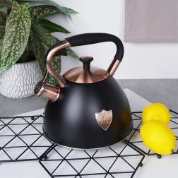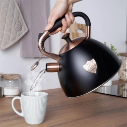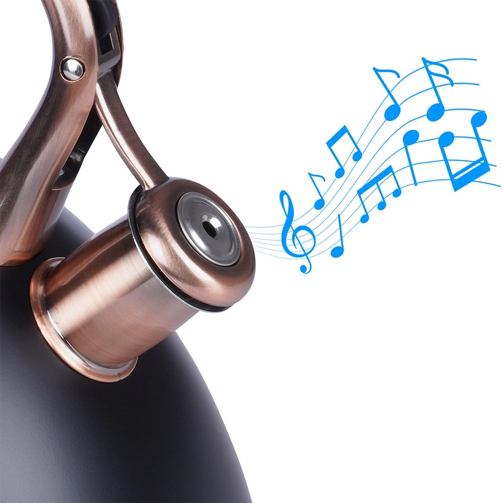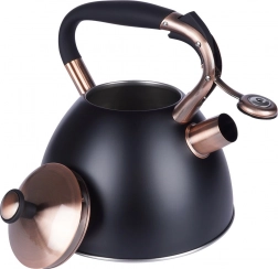 Stijlvolle stalen fluitketel met een inhoud van 3 l in matzwart met koperen accenten, voor snel waterverwarmen en comfortabel schenken. Gemaakt van hoogwaardig roestvrij staal, met een ergonomische Soft Touch greep, een automatisch fluitdeksel en een meerlaagse akuthermische bodem voor snelle opwarming op alle soorten kookplaten, inclusief inductie.