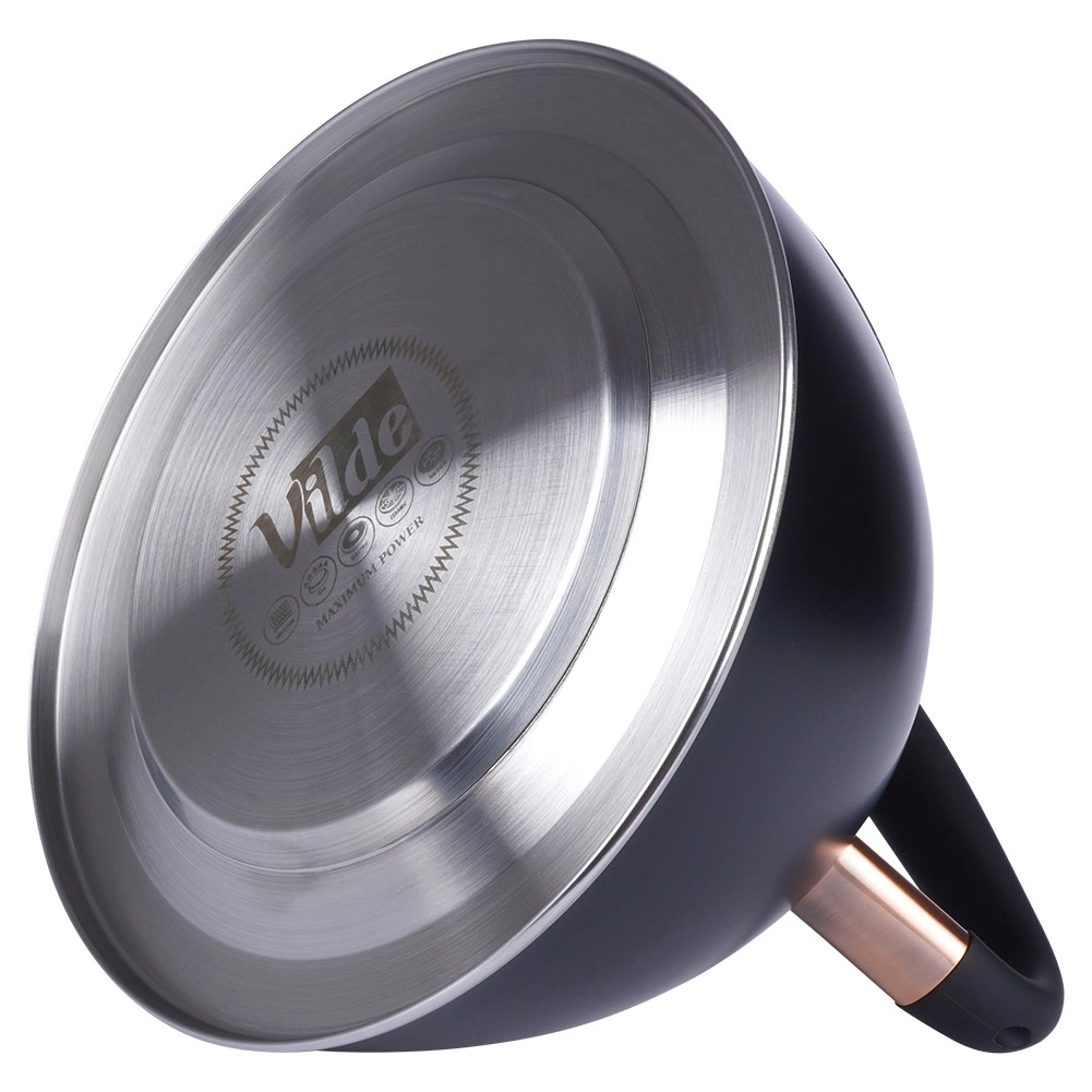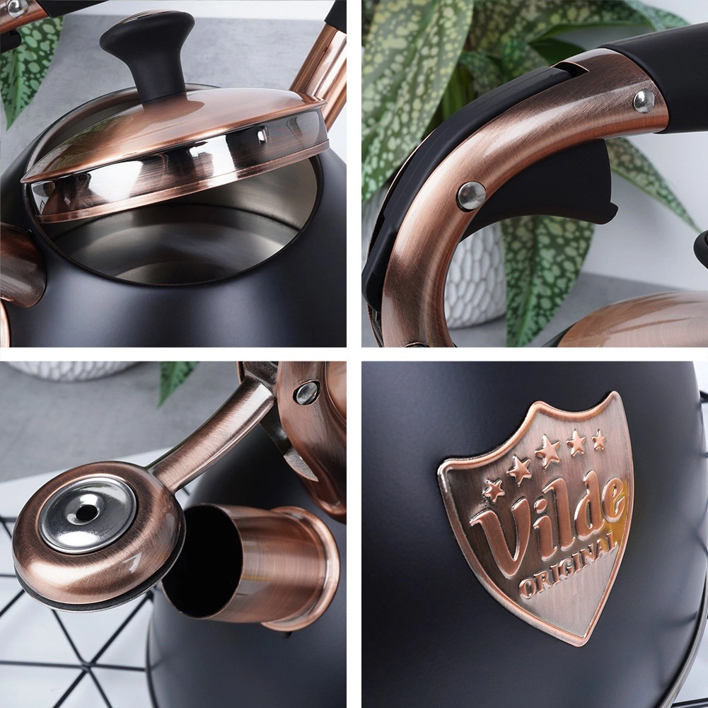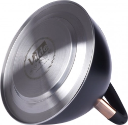 Deze designketel van roestvrij staal combineert een matzwarte afwerking met elegante koperen details. Dankzij het bruikbare volume van 2,5 l (totaal 3 l) kookt u moeiteloos water voor koffie, thee en kruiden voor het hele gezin. De akuthermische bodem zorgt voor snelle en gelijkmatige warmtedistributie, zelfs op een lage vlam, wat energie en tijd bespaart.