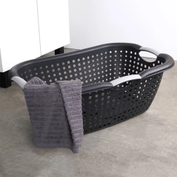 Deze veelzijdige wasmand in elegant zwart biedt een royale inhoud van 26 liter en een doordachte vorm voor comfortabel gebruik thuis of in de wasserette. Dankzij de perforaties aan de zijkanten wordt het wasgoed beter geventileerd en blijft het fris.