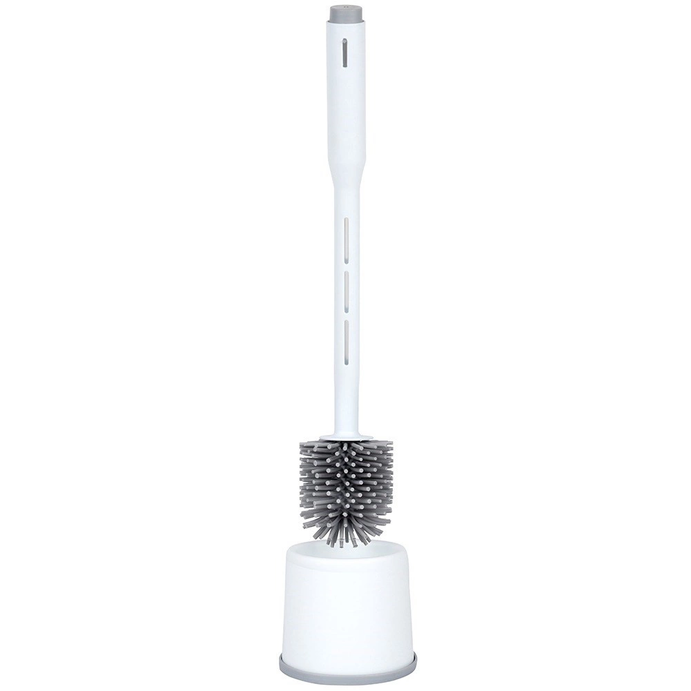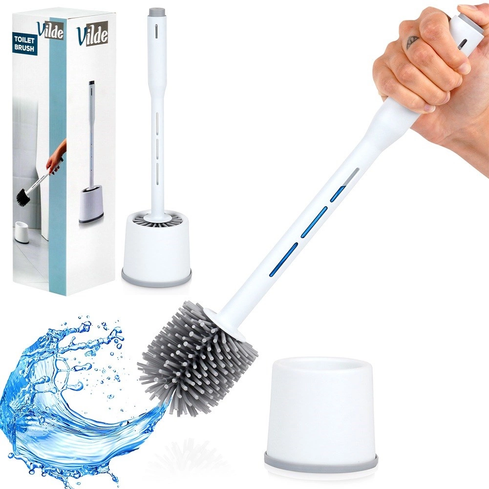 De dichte siliconen haren verwijderen effectief vuil en kalkaanslag zonder het oppervlak van de pot te krassen. De geventileerde houder met antislip bodem houdt de borstel rechtop, versnelt het drogen en zorgt voor maximale hygiëne en een nette uitstraling in kleine badkamers.