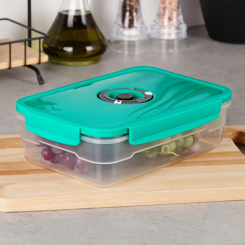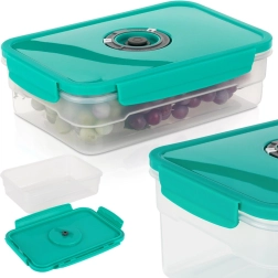 De vacuümdoos van 1,2 l is ideaal voor het bewaren van fruit, groenten, restjes en tussendoortjes. Het speciale ventiel in het deksel maakt eenvoudig luchtwegsaugen met een handpompje mogelijk en verlengt zo de versheid en smaak van opgeslagen etenswaren. Het transparante lichaam maakt controle van de inhoud gemakkelijk en de compacte vorm bespaart ruimte in de koelkast.