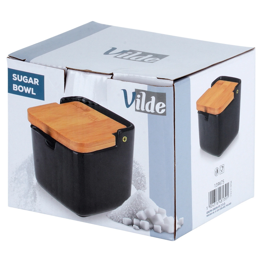 Elegante zwarte suikerschaal met een inhoud van 250 ml, voorzien van een kantelbaar bamboe deksel en een praktische uitsparing voor een lepeltje. Ideaal voor dagelijks serveren en bewaren van suiker of kruiden. Inclusief bijpassend keramisch lepeltje. De combinatie van keramiek en bamboe zorgt voor een modern uiterlijk, gemakkelijke dosering en bescherming van de inhoud tegen vuil.