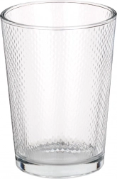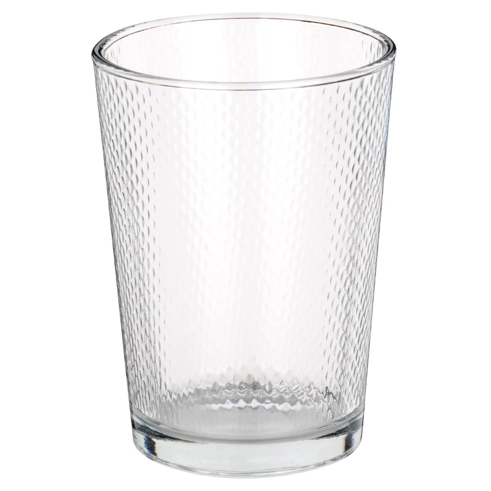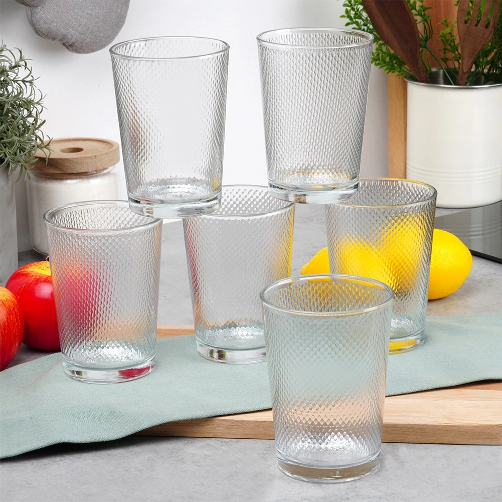 Elegante set van zes glazen met een inhoud van 425 ml, gemaakt van dikwandig glas met een gestructureerd oppervlak voor een zekere grip. Ideaal voor water, limonade, sappen en drankjes, geschikt voor de vaatwasser en perfect voor dagelijks gebruik thuis en in de horeca.