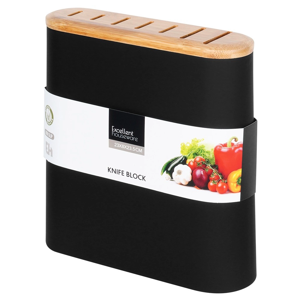 Stijlvolle en functionele messenstandaard met afmetingen 23 × 8 × 23,5 cm voor overzichtelijke, veilige en hygiënische opslag van messen – van staal tot keramiek en combinaties. De matte zwarte behuizing met aangename soft-touch afwerking en de bamboe bovenkant met sleuven vormen een tijdloze toevoeging aan elke keuken.