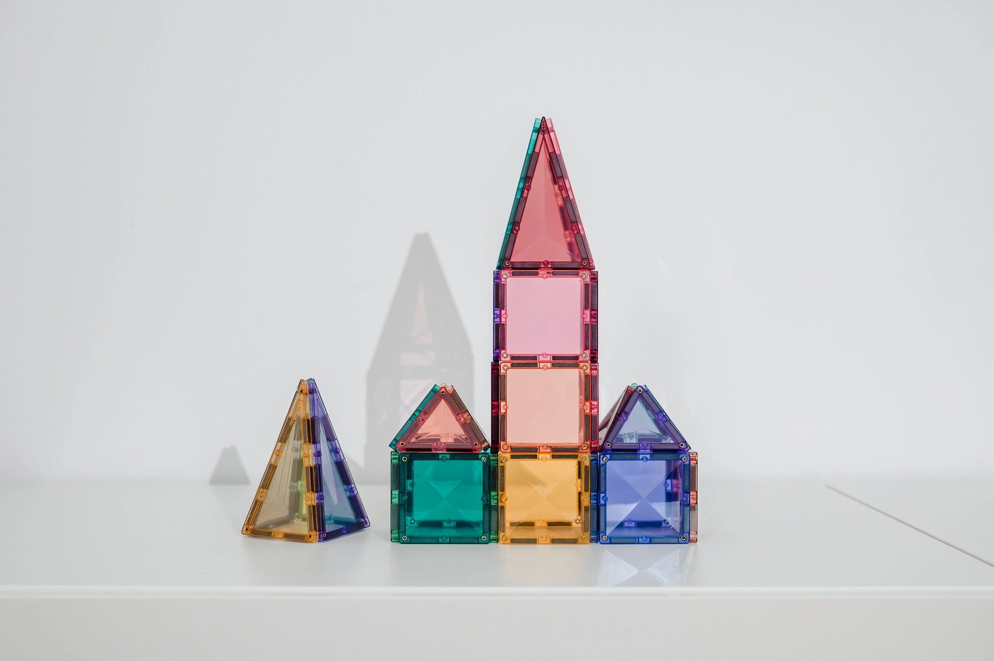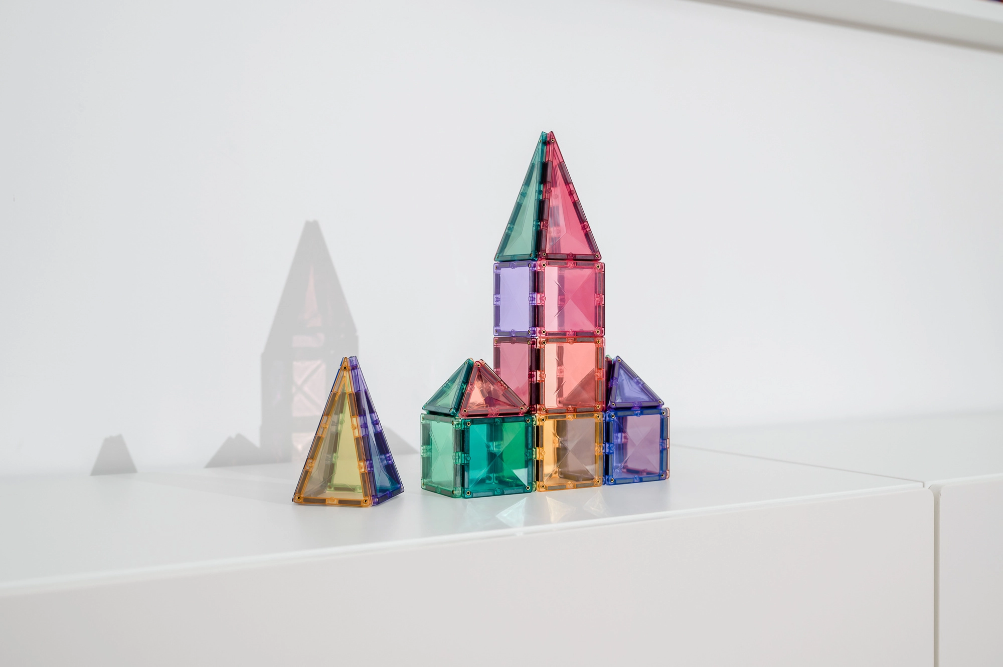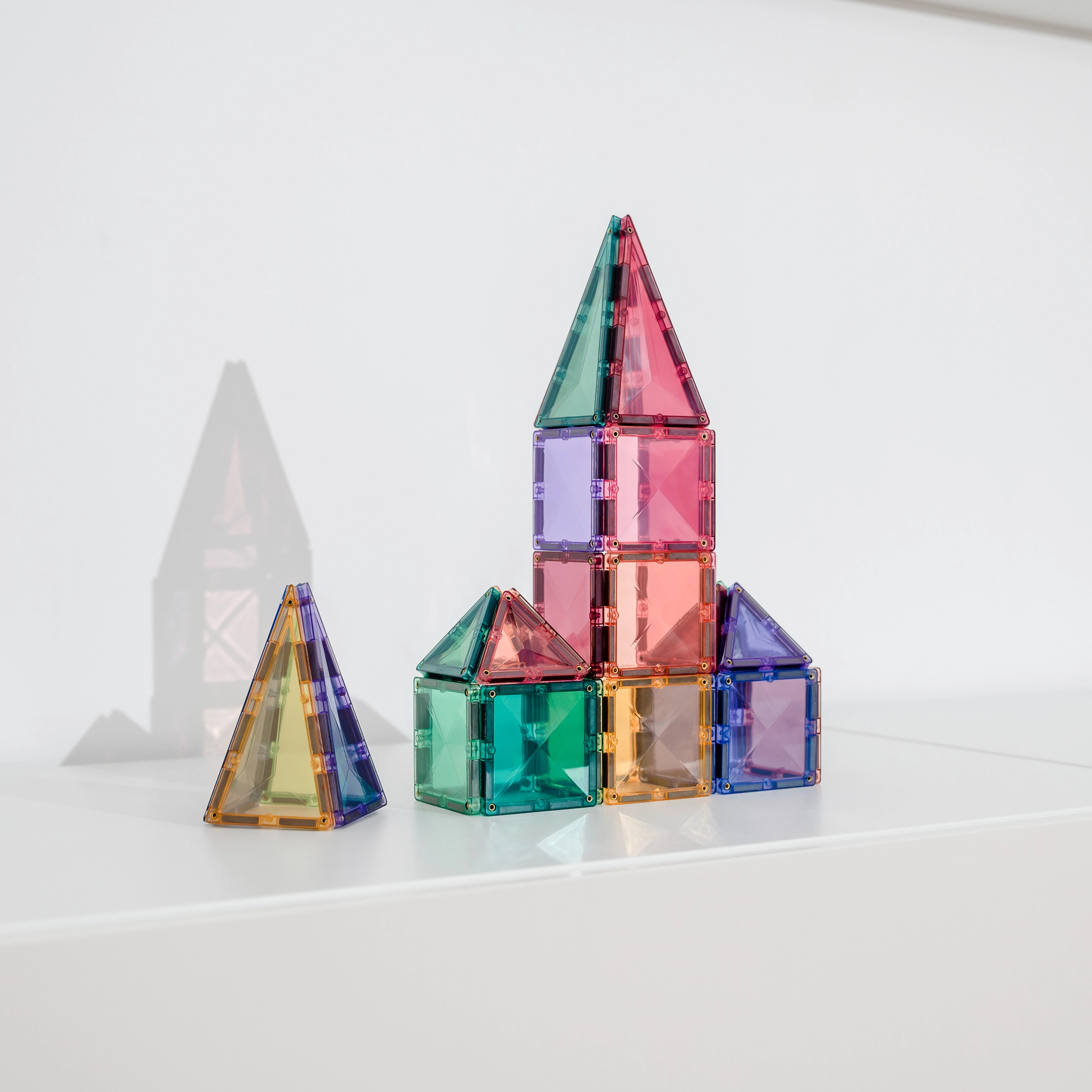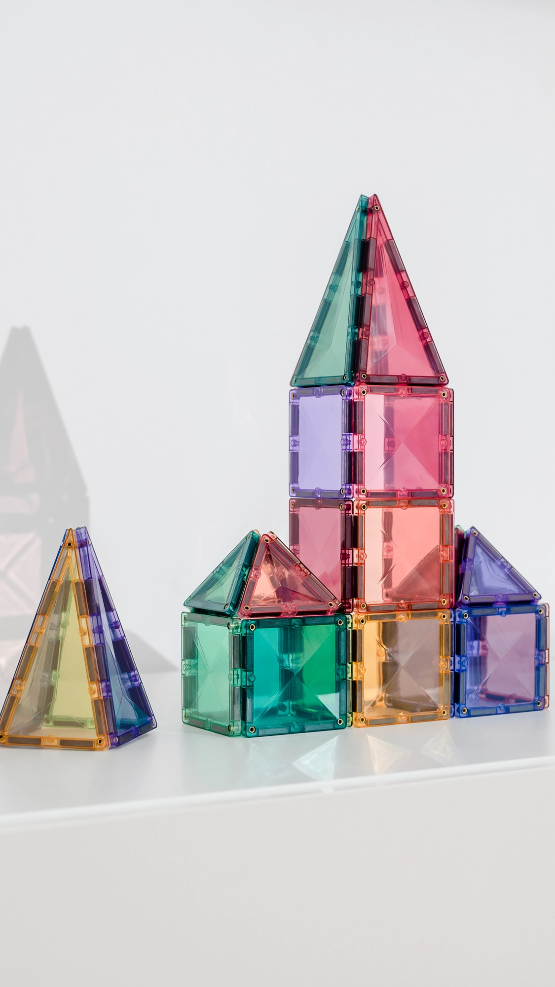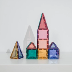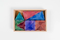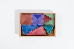 De set bevat 16 kleine vierkanten, 8 gelijkzijdige driehoeken en 8 gelijkbenige driehoeken plus een geïllustreerd inspiratieboekje. Dankzij de compatibiliteit met andere CONNETIX-sets breid je bouwwerken eindeloos uit. Transparante kleuren laten prachtig licht door en stimuleren zintuiglijk spel.