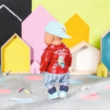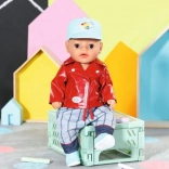Stijlvolle outfit voor BABY born poppen van 36 cm met een motorlook: een rode jas in lederlook met een berenprint, grijs‑blauwe broek, blauwe sneakers en een pet met eendje Berta. Easy fit-snit voor eenvoudig omkleden, inclusief een kledinghanger.