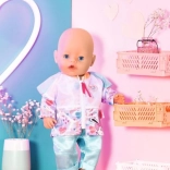 Stijlvolle set voor poppen van 43 cm van BABY BORN: een comfortabele jas in lichtpaars met kleurrijke print en glanzende aquamarijnkleurige broek met naden die doen denken aan zwembadtegeltjes. De outfit valt op door het transparante overslag-effect en is ideaal voor gevarieerd, langdurig speelplezier. Kledinghanger inbegrepen.