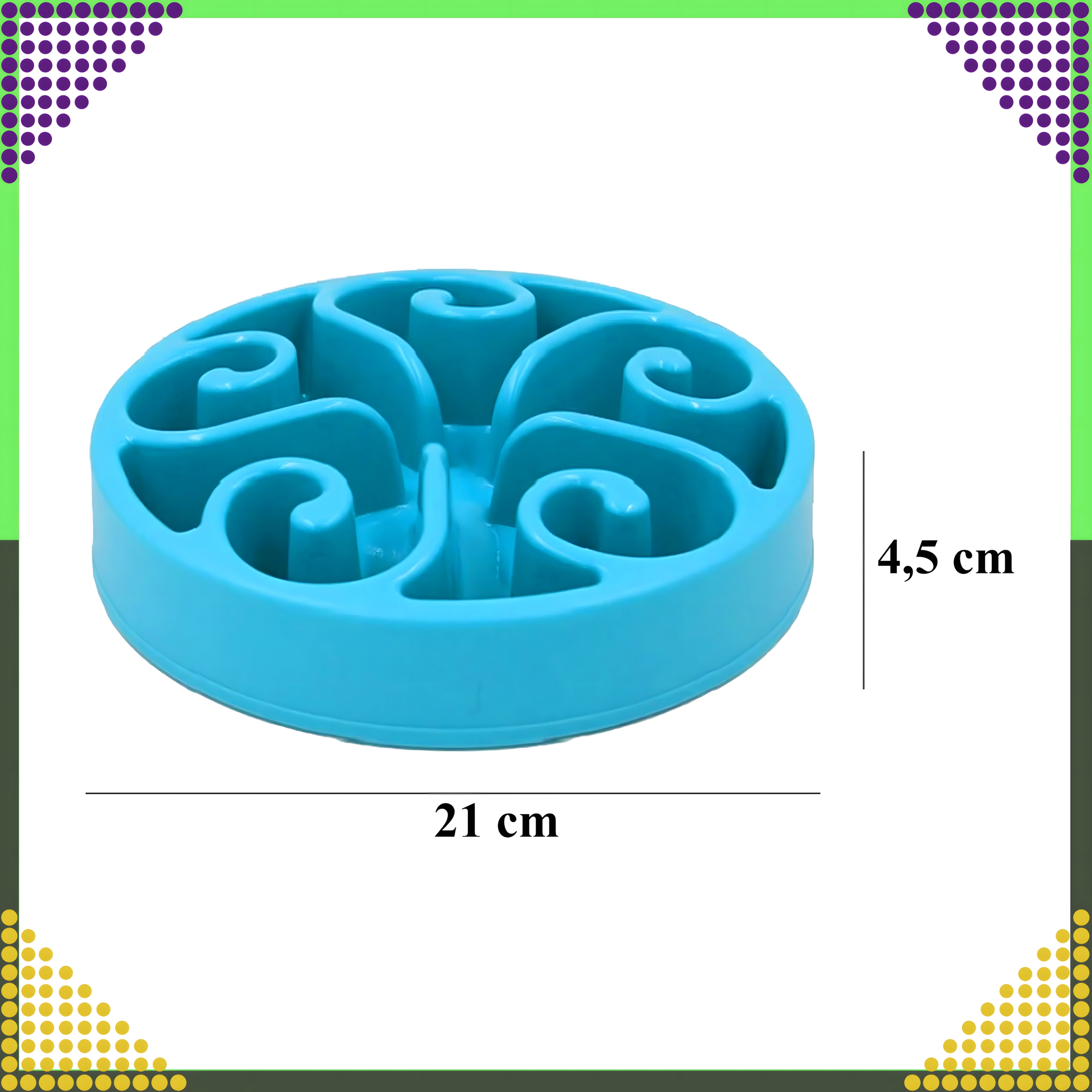Deze slowfeed-voerbak is ontworpen zodat het dier rustig kan eten zonder te schrokken. Verhoogde kanaaltjes en schotjes verdelen brokken of natvoer in kleinere porties, waardoor de hond of kat het voedsel moet “opjagen” en in delen verwerken. Dit vertraagt het eettempo op natuurlijke wijze en ondersteunt een gezonde spijsvertering.