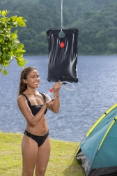 Dankzij het volume van 20 liter biedt hij voldoende water voor meerdere korte douches. De douche heeft een versterkte ophanglus voor veilige bevestiging aan een tak, haak of touw en een doucheslang met uiteinde voor comfortabel regelen van de waterstroom. Na het leeglaten vouwt hij plat op en neemt hij weinig ruimte in in de rugzak.