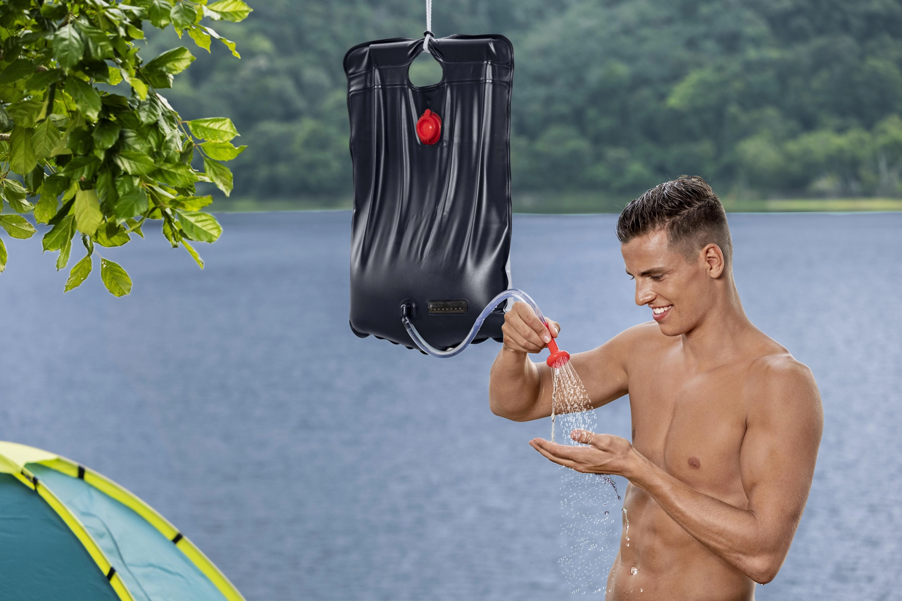 De versterkte ophanging en vulopening maken snelle montage aan een tak of haak mogelijk. De flexibele slang met douchekop vergemakkelijkt afspoelen en douchen.
