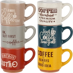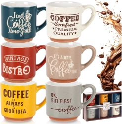 Stijlvolle set van zes keramische espressokopjes met een inhoud van 110 ml in verschillende kleuren met opschriften. Bieden duurzame keramiek, een comfortabele oor en zijn geschikt voor vaatwasser en magnetron – ideaal voor dagelijkse koffierituelen thuis en op kantoor.