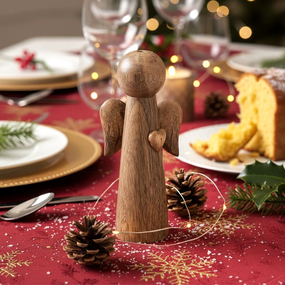 De minimalistische engel komt prachtig tot zijn recht in het midden van de feesttafel, gecombineerd met takjes, kaarsen en winterdecoratie.