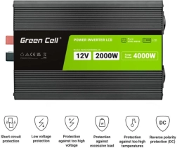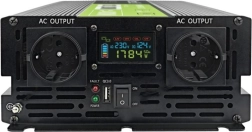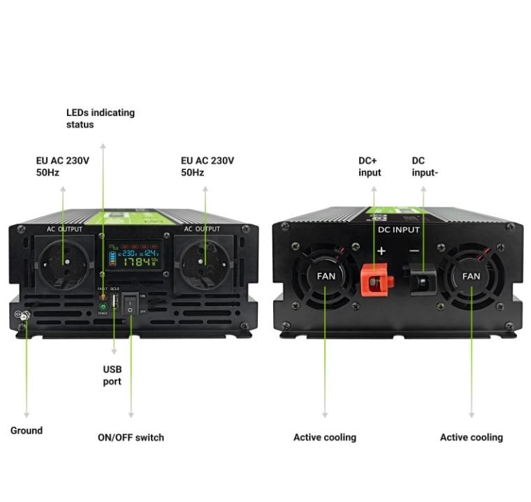 Het geïntegreerde LCD‑display toont spanning, belasting en de geschatte laadstatus van de accu, zodat u eenvoudig onderspanning en overbelasting voorkomt. De robuuste geribde metalen behuizing, twee AC‑stopcontacten en efficiënte koeling zorgen voor betrouwbare werking, ook bij zware belasting.