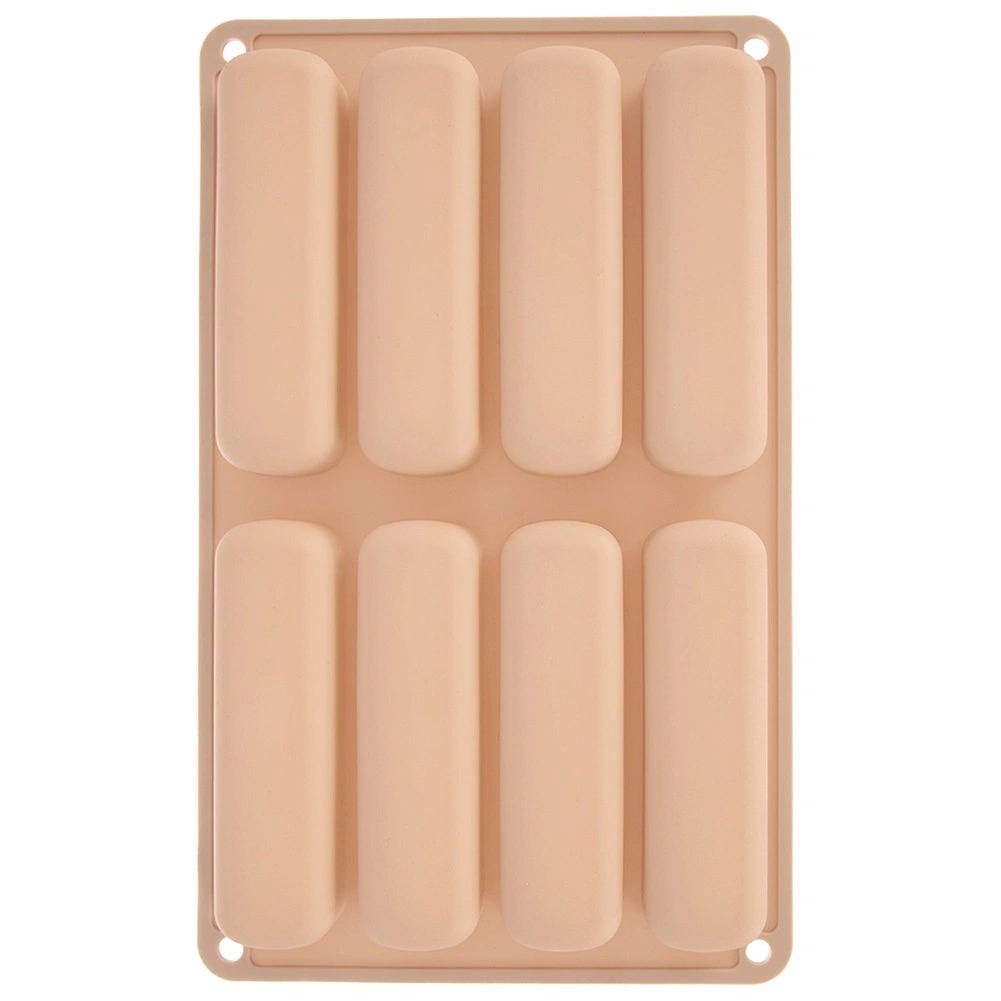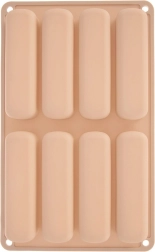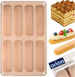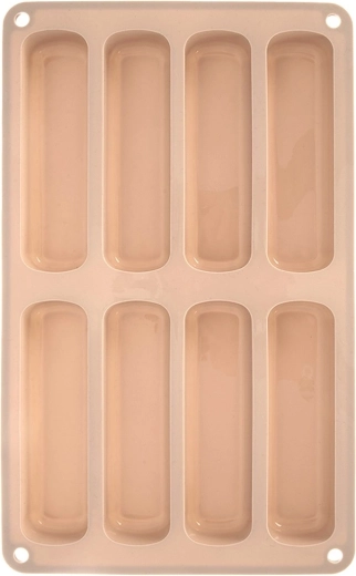 Deze beige siliconen vorm is ideaal voor het maken van langwerpige lange vingers voor tiramisu, desserts in glaasjes en klassieke koekjes. De afmetingen van de vorm zijn 28 × 17 × 2 cm en elk stuk meet 11,5 × 3 × 2 cm. Het materiaal is licht, flexibel en duurzaam, wat gelijkmatig bakken en gemakkelijk lossen zonder vastplakken garandeert.