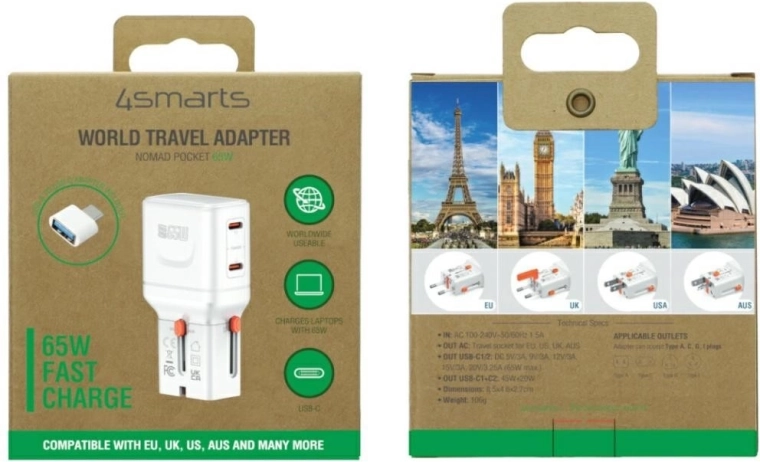 Deze 4smarts World Travel Adapter Nomad Pocket reisoplader gebruikt moderne GaN-technologie voor hogere efficiëntie, minder warmteontwikkeling en een compacter formaat bij een vermogen tot 65 W. Zo laad je smartphones, tablets en geselecteerde laptops snel op via USB Power Delivery.