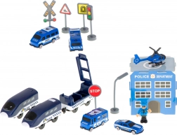 36 rails + koppelingen, brug, tunnel, 2 locomotieven, te openen wagon, 4 politievoertuigen, helikopter, politieagentfiguur, 6 borden, kartonnen politiestation met helikopterplatform, stickers, handleiding met trajectvoorstellen