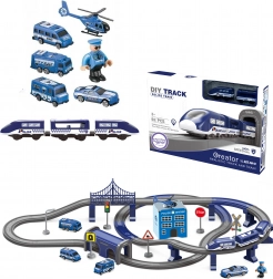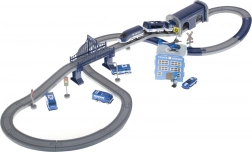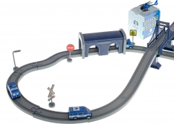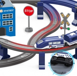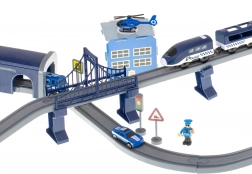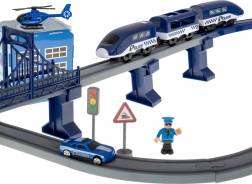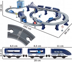 Ontdek de actievolle wereld van de politie met dit elektrische treincircuit – een set met 92 onderdelen en een spoorlengte tot 300 cm. Tweelaags rails met een brug en tunnel, een batterij-aangedreven locomotief, politieauto’s, helikopter en een station met helikopterplatform toveren de kamer om tot het centrum van de actie. Perfect voor creatief spel, ontwikkeling van motoriek en het leren van verkeersregels.