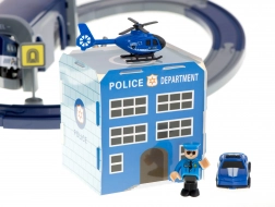 Politiestation met helikopterplatform, 4 verschillende voertuigen, een helikopter, een politieagentfiguur en verkeersborden – alles voor realistische acties en het leren van verkeersregels.