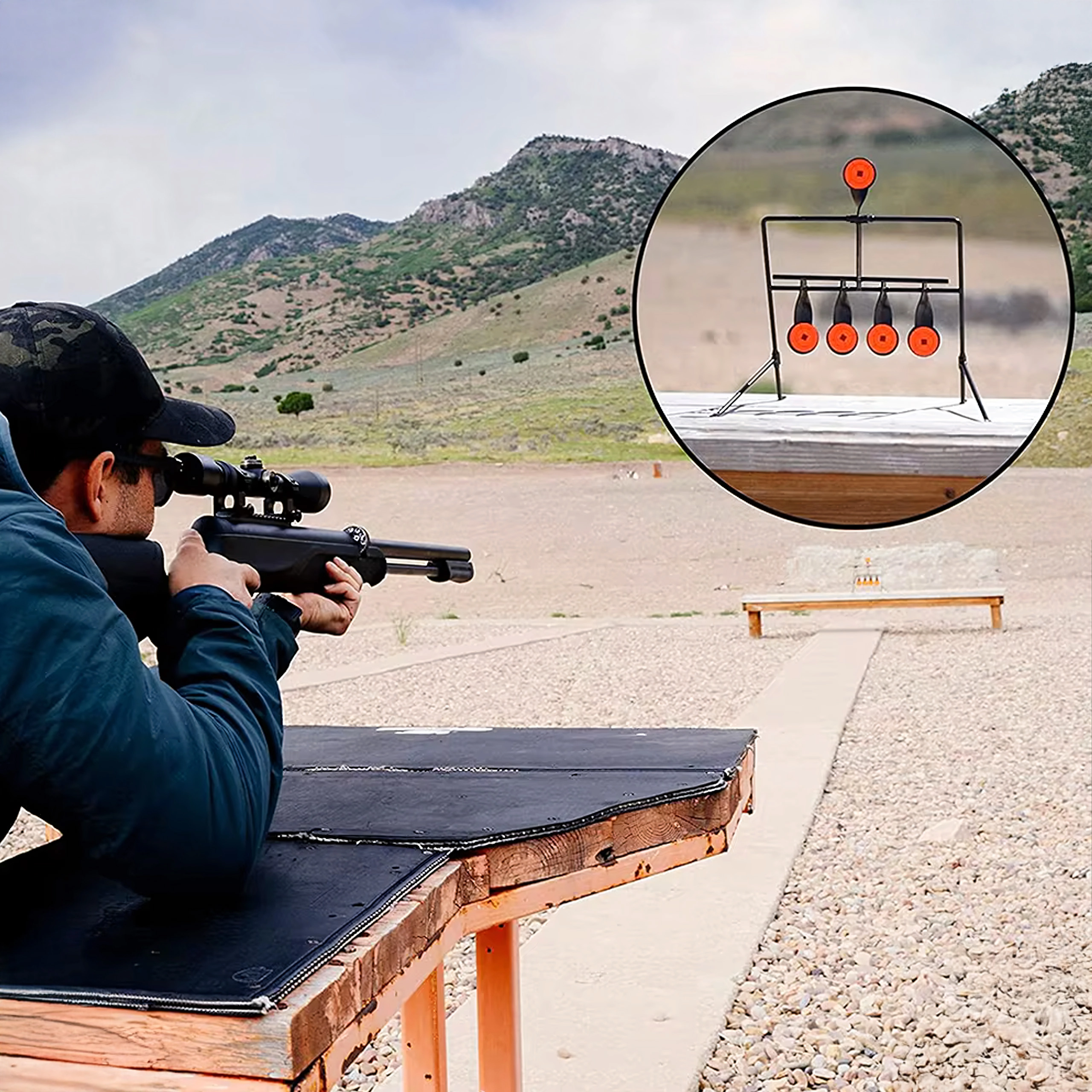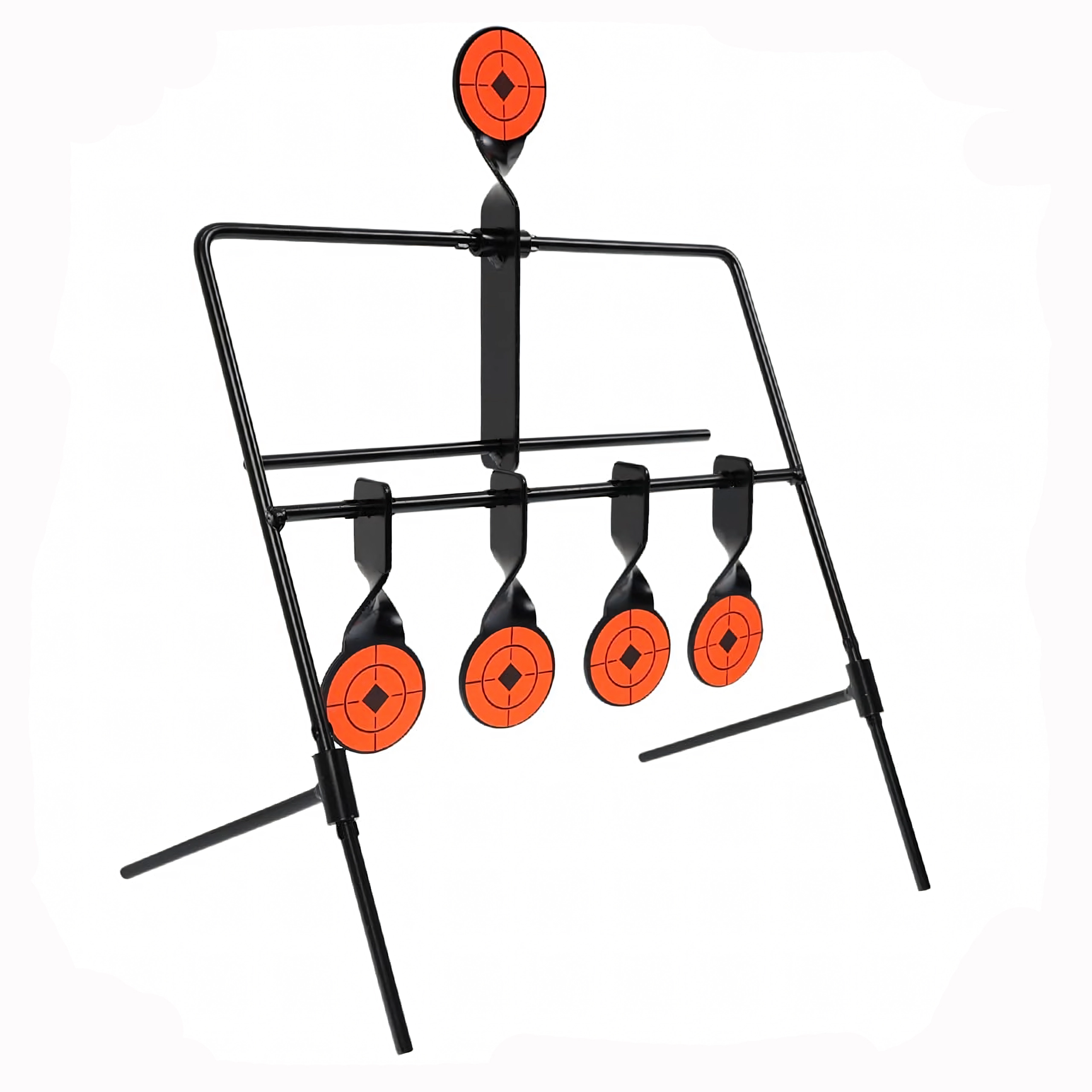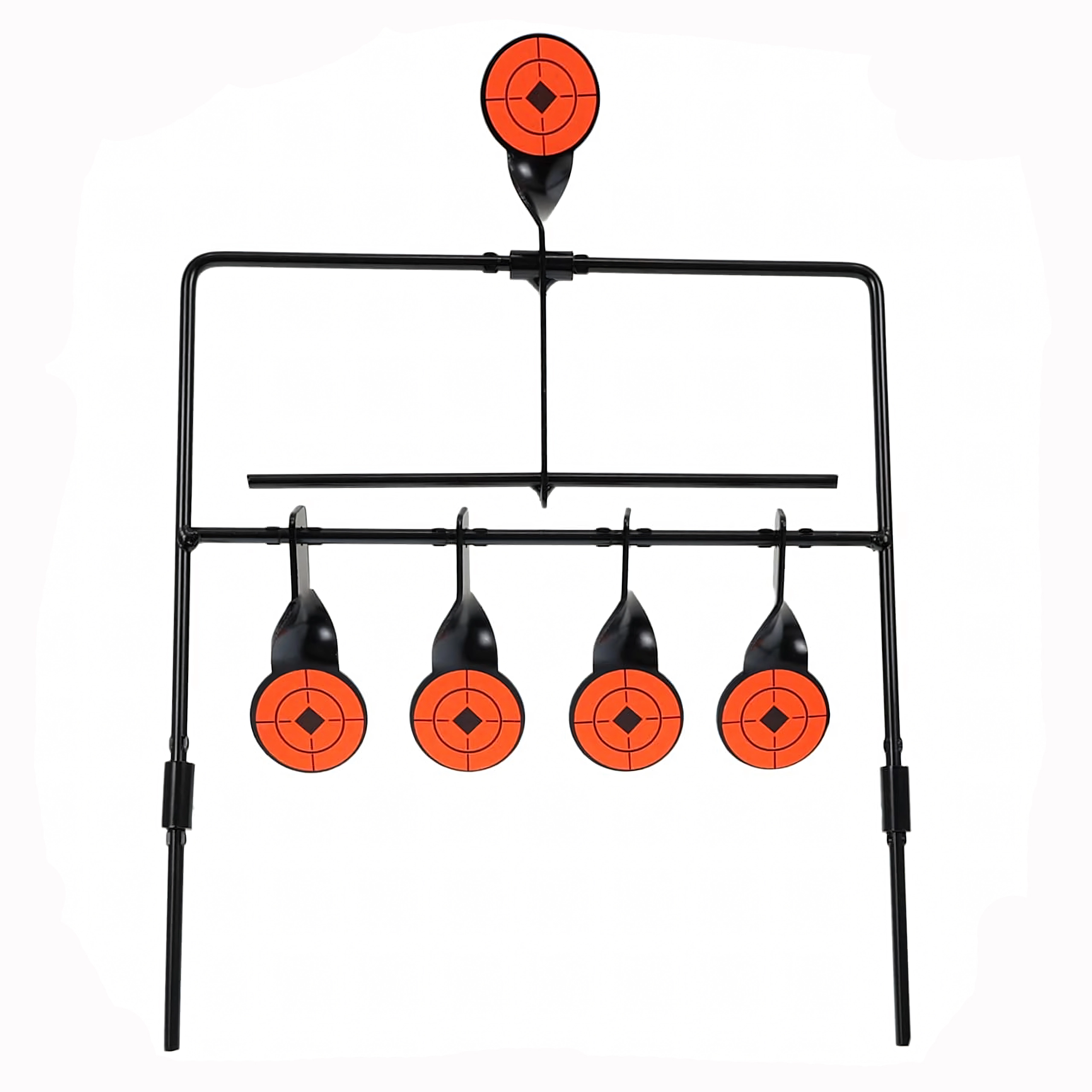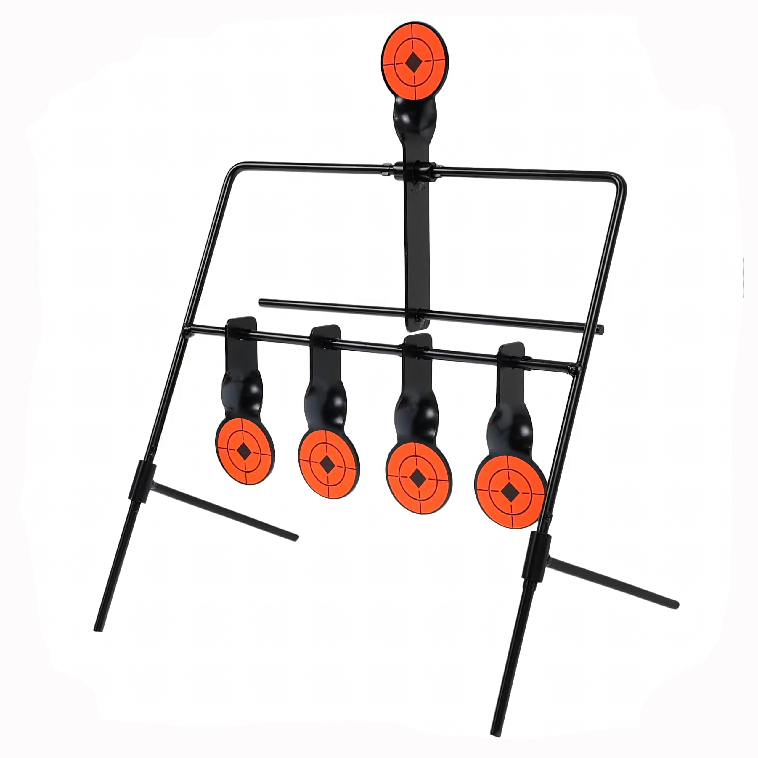 Praktisch stalen schietdoel met vijf reactieve targets en bovenste reset voor vloeiende richttraining. Dankzij de feloranje schijven is een treffer goed zichtbaar en klapt de constructie na een hit automatisch om. Ideaal voor precisie en snelle drills – stabiel frame, eenvoudige installatie en automatisch resetten zonder de schietsessie te onderbreken.