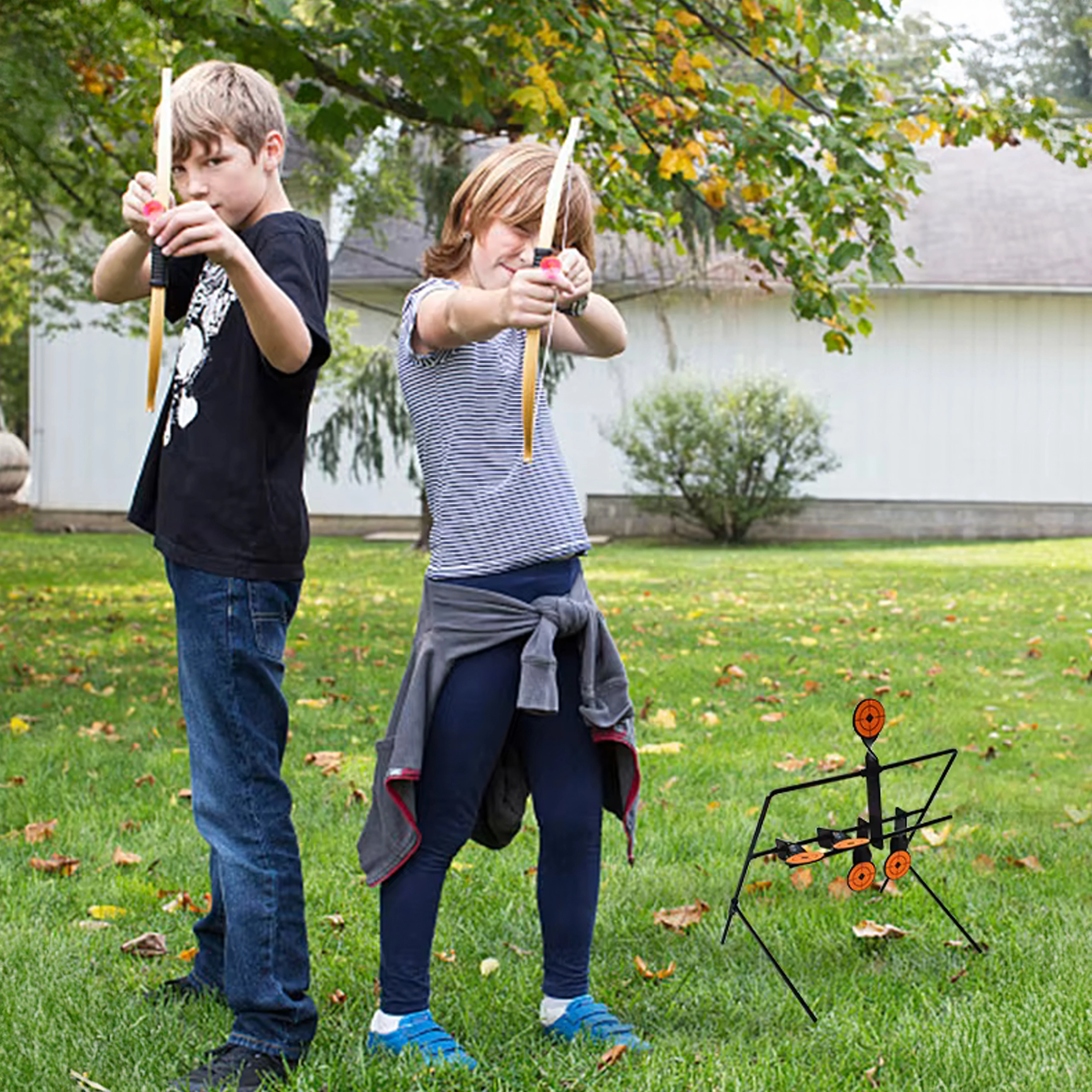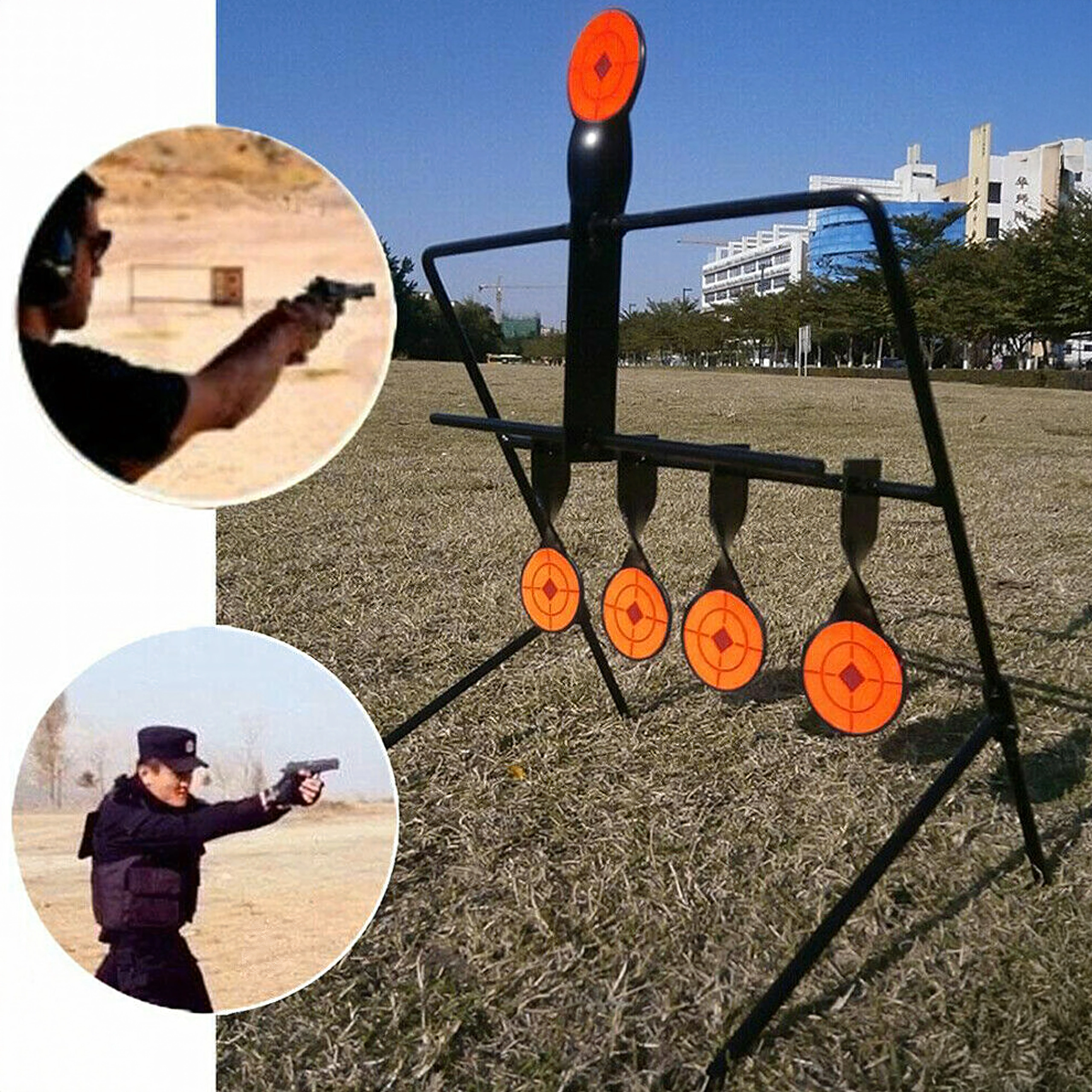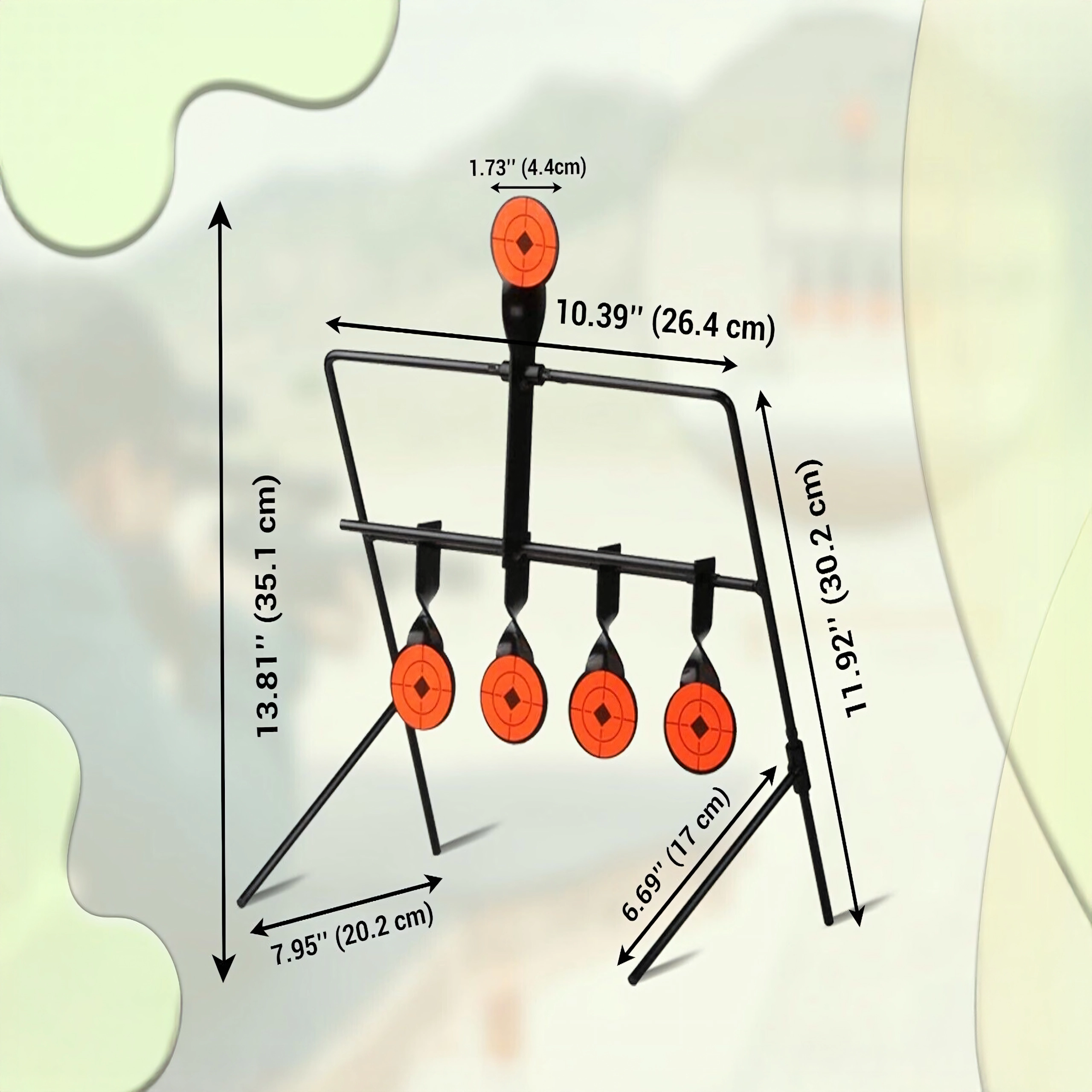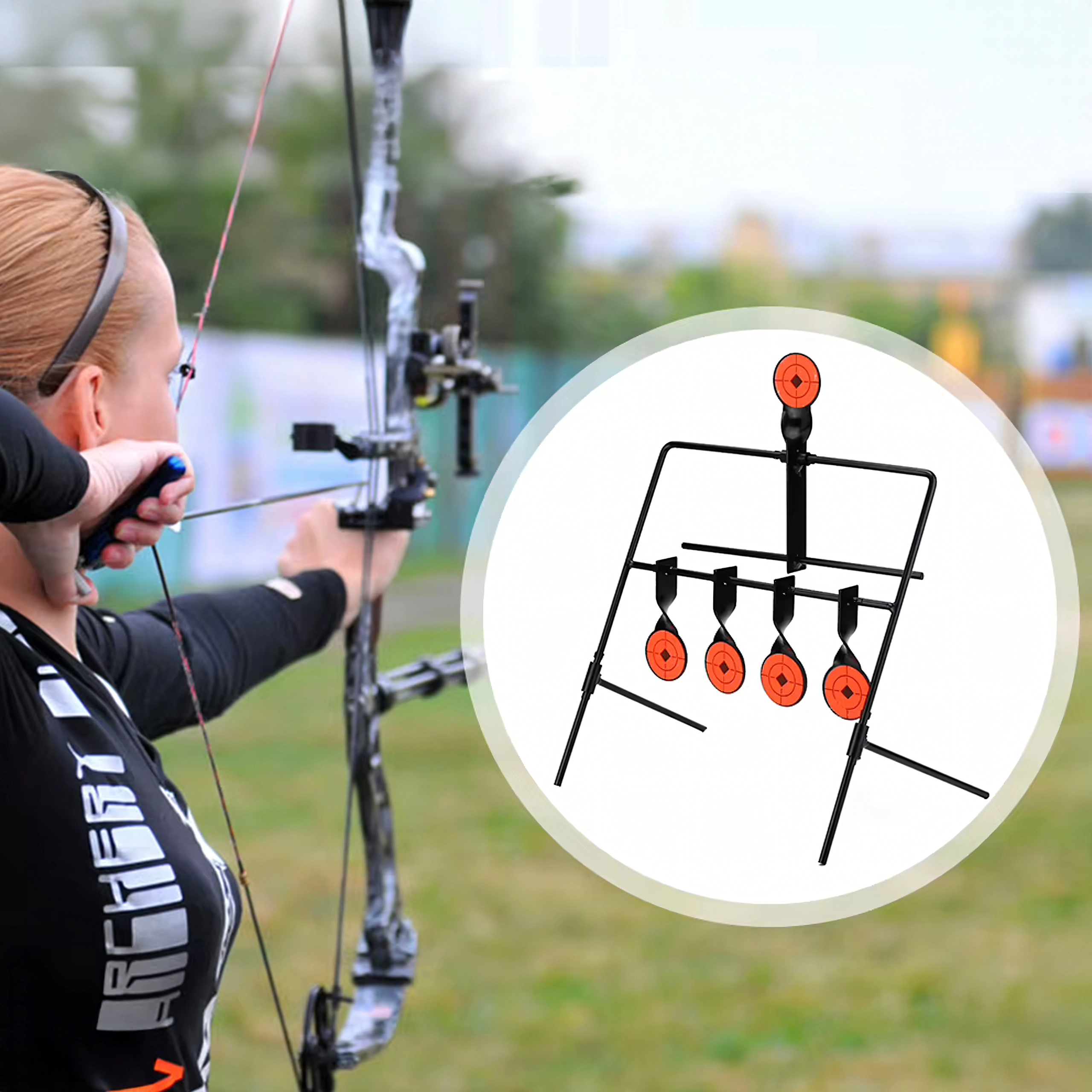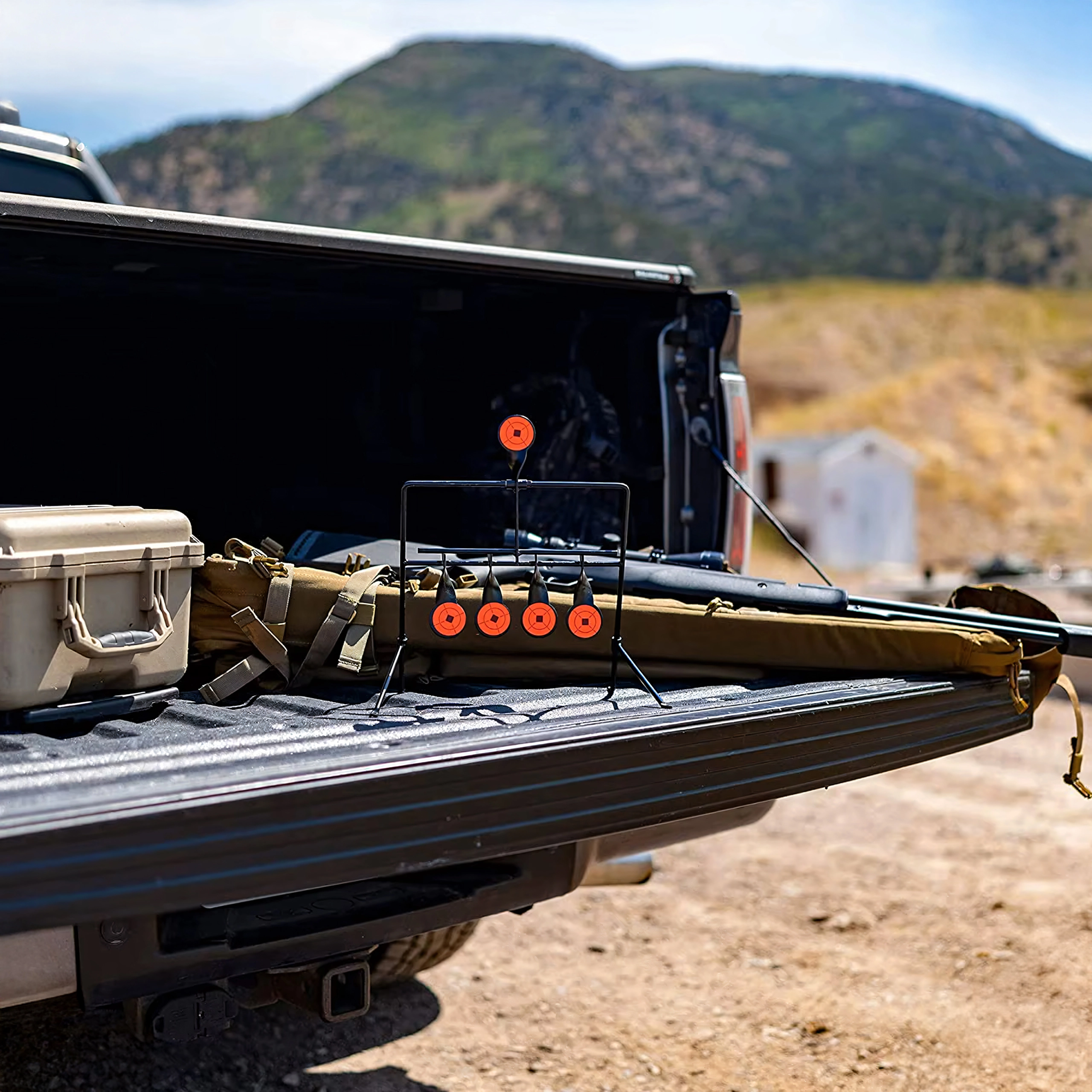 Praktisch stalen schietdoel met vijf reactieve targets en bovenste reset voor vloeiende richttraining. Dankzij de feloranje schijven is een treffer goed zichtbaar en klapt de constructie na een hit automatisch om. Ideaal voor precisie en snelle drills – stabiel frame, eenvoudige installatie en automatisch resetten zonder de schietsessie te onderbreken.