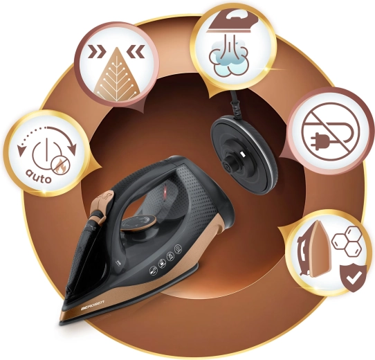 Soepel glijden, gelijkmatige stoomverdeling en gemakkelijk strijken, zelfs op moeilijk bereikbare plekken dankzij de precieze punt.