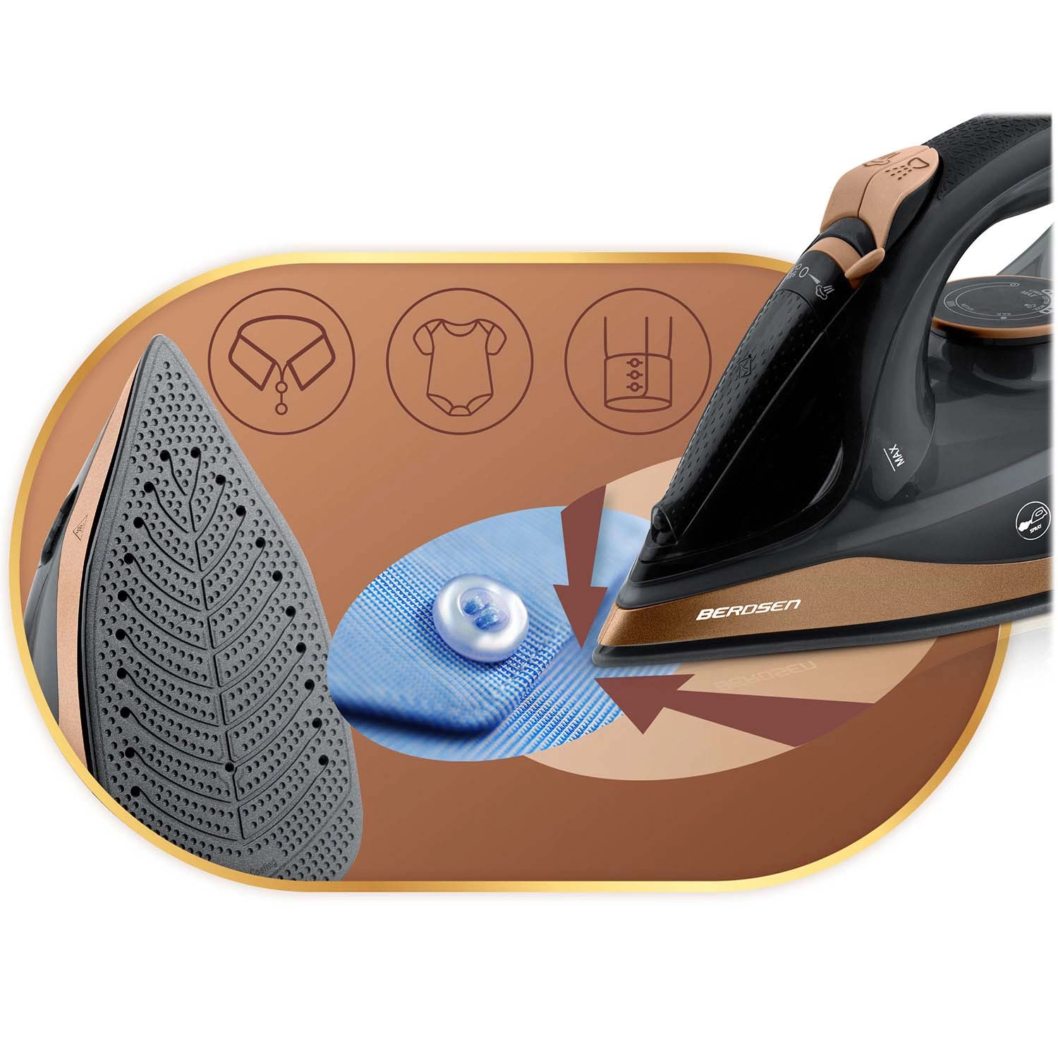 Het Berdsen-strijkijzer combineert een krachtig vermogen van 2600 W en een gladde keramische zool met microkanalen voor een gelijkmatige stoomverdeling. Met verticaal stomen strijkt u gordijnen of kleding op een hanger zonder strijkplank. Het waterreservoir van 320 ml en de praktische spray zorgen voor gerichte bevochtiging van zelfs de meest hardnekkige kreuken.