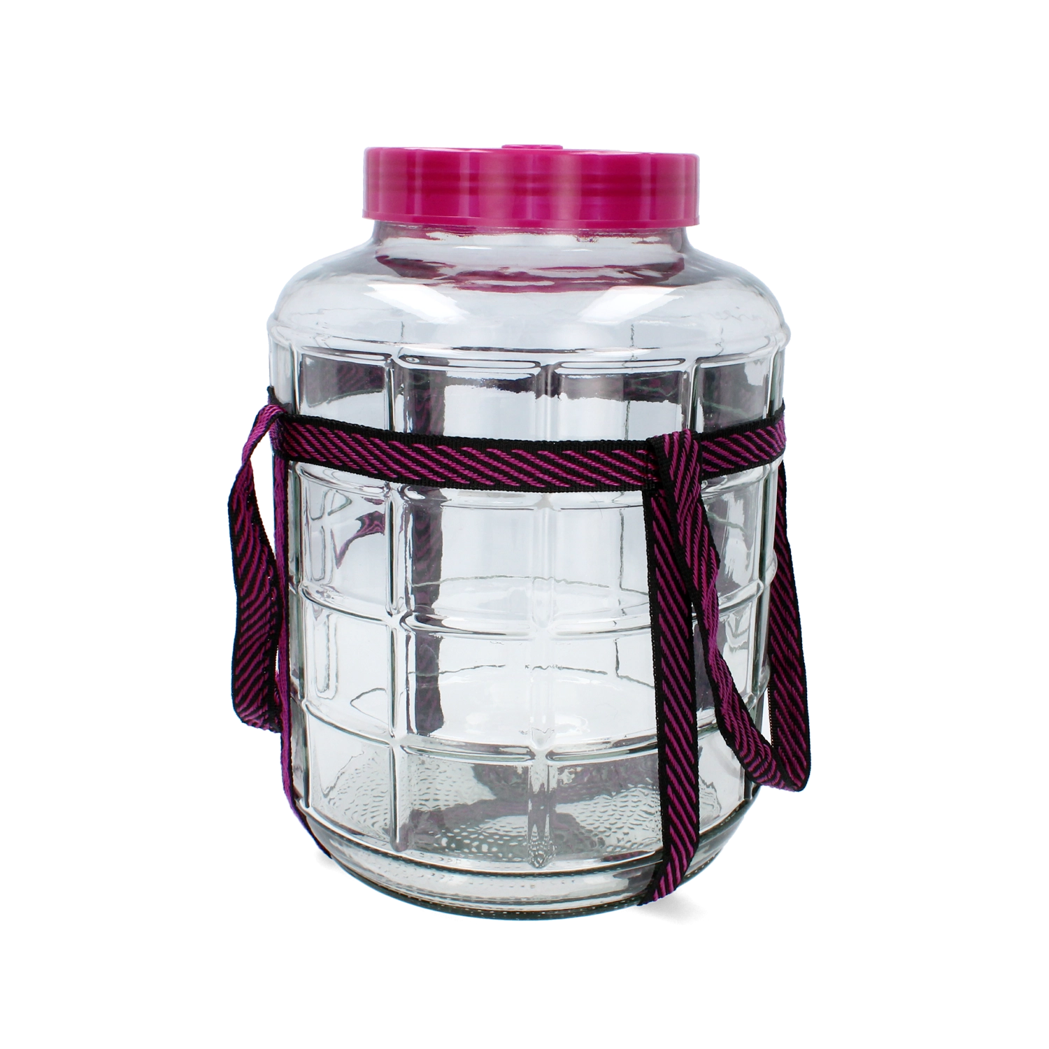 Universele glazen mandfles met een inhoud van 15 l, ideaal voor zelfgemaakte wijn, limonades, likeuren en het inmaken van komkommers. Biedt een brede hals voor eenvoudig vullen, stevig glas voor veilig fermenteren en een praktische draagriem voor comfortabel transport. Het elegante reliëfpatroon geeft stijl aan elke voorraadkast.