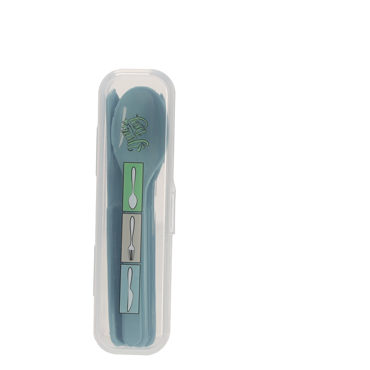 Praktische set van plastic bestek in een reisetui met een lepel, vork en mes in een elegante blauwe kleur. Dankzij het compacte etui blijft het bestek hygiënisch, schoon en altijd binnen handbereik – ideaal voor werk, school, picknicks en onderweg.
