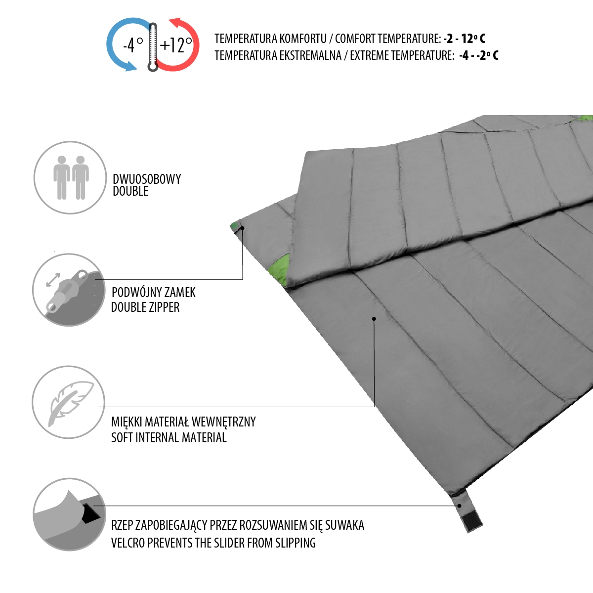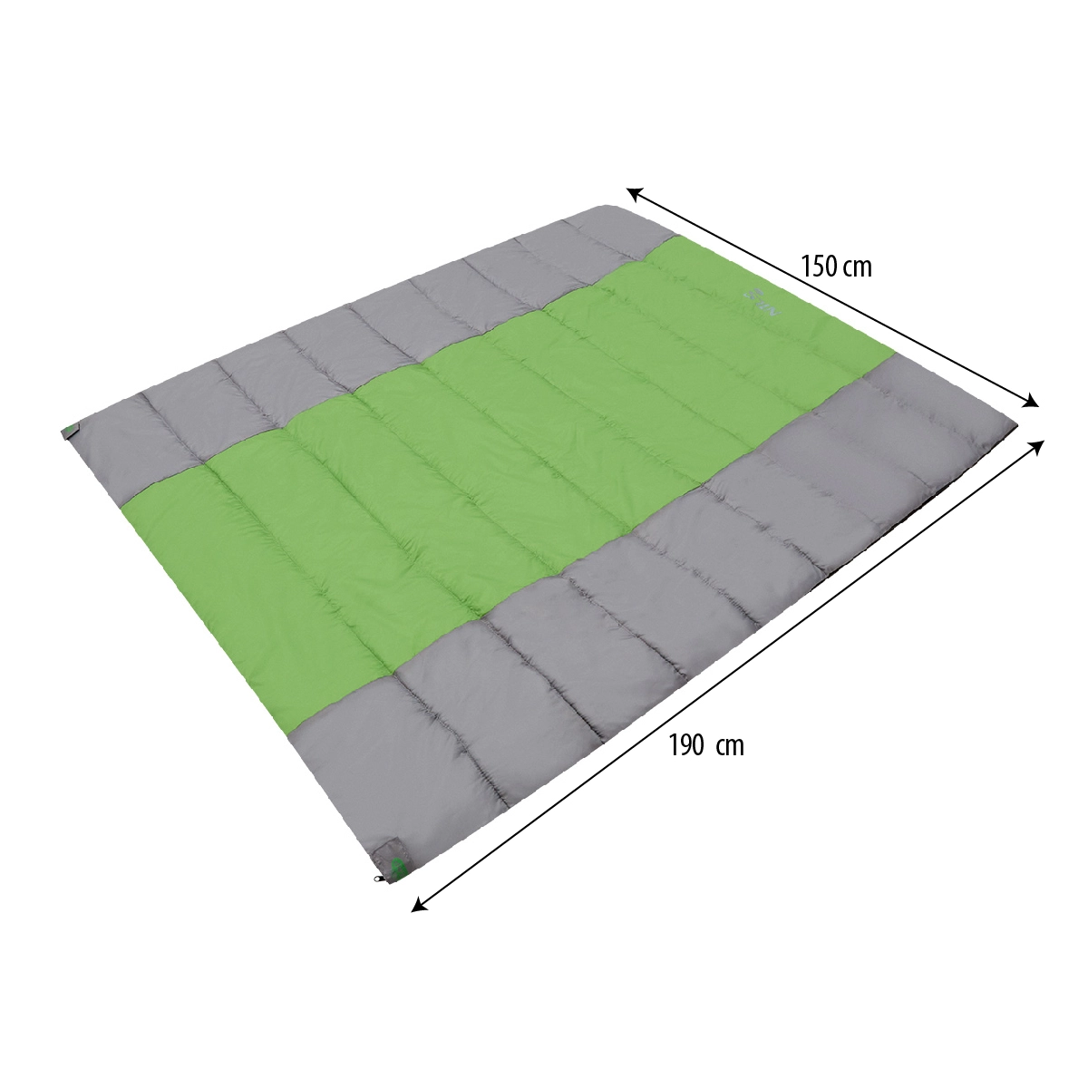 De slaapzak voor twee is ontworpen om maximale warmte en comfort te bieden onder diverse omstandigheden. De binnenzijde van 190T Pongee voelt prettig aan, de buitenzijde van 190T polyester W/R Cire is beter bestand tegen vocht en kou en de polyestervulling 250 g/m2 zorgt voor gelijkmatige isolatie – dit wordt ondersteund door de hoogwaardige doorgestikte naden die het verschuiven van de vulling voorkomen.