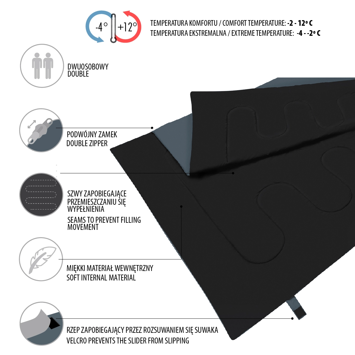 Geniet samen van het buitenleven met de ruime tweepersoons slaapzak van NILS Camp, die comfort voor twee, hoogwaardige afwerking en betrouwbare thermische isolatie biedt. Dankzij de tweezijdige rits maak je hem eenvoudig open tot een deken, en het praktische kussenpaneel zorgt voor extra comfort. Slijtvaste materialen beschermen tegen kou en vocht en de gelijkmatige doorgestikte banen voorkomen het verschuiven van de vulling.