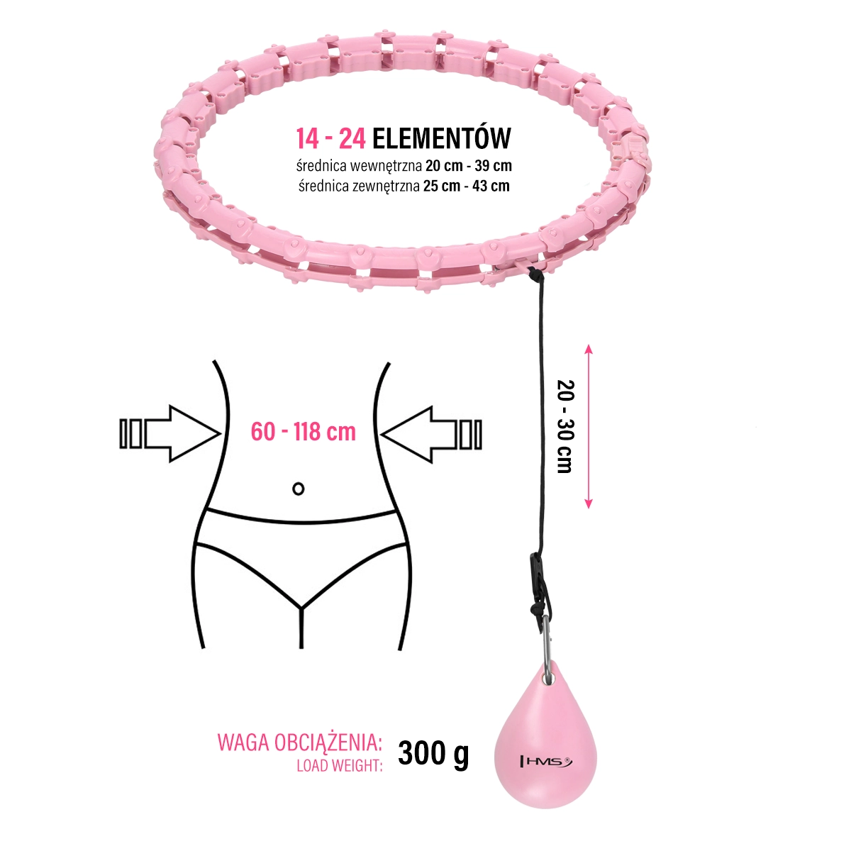 HMS HHW02 is een moderne hula-hoepel met verstelbare lengte en een roterend gewicht van 300 g, dat de trainingsintensiteit verhoogt. De opvouwbare constructie uit 24 segmenten maakt het gemakkelijk om de tailleomtrek aan te passen (60–118 cm). Interne massagepanelen stimuleren aangenaam de buik- en taillezones, terwijl de vloeiende beweging de belasting op rug en heupen vermindert.