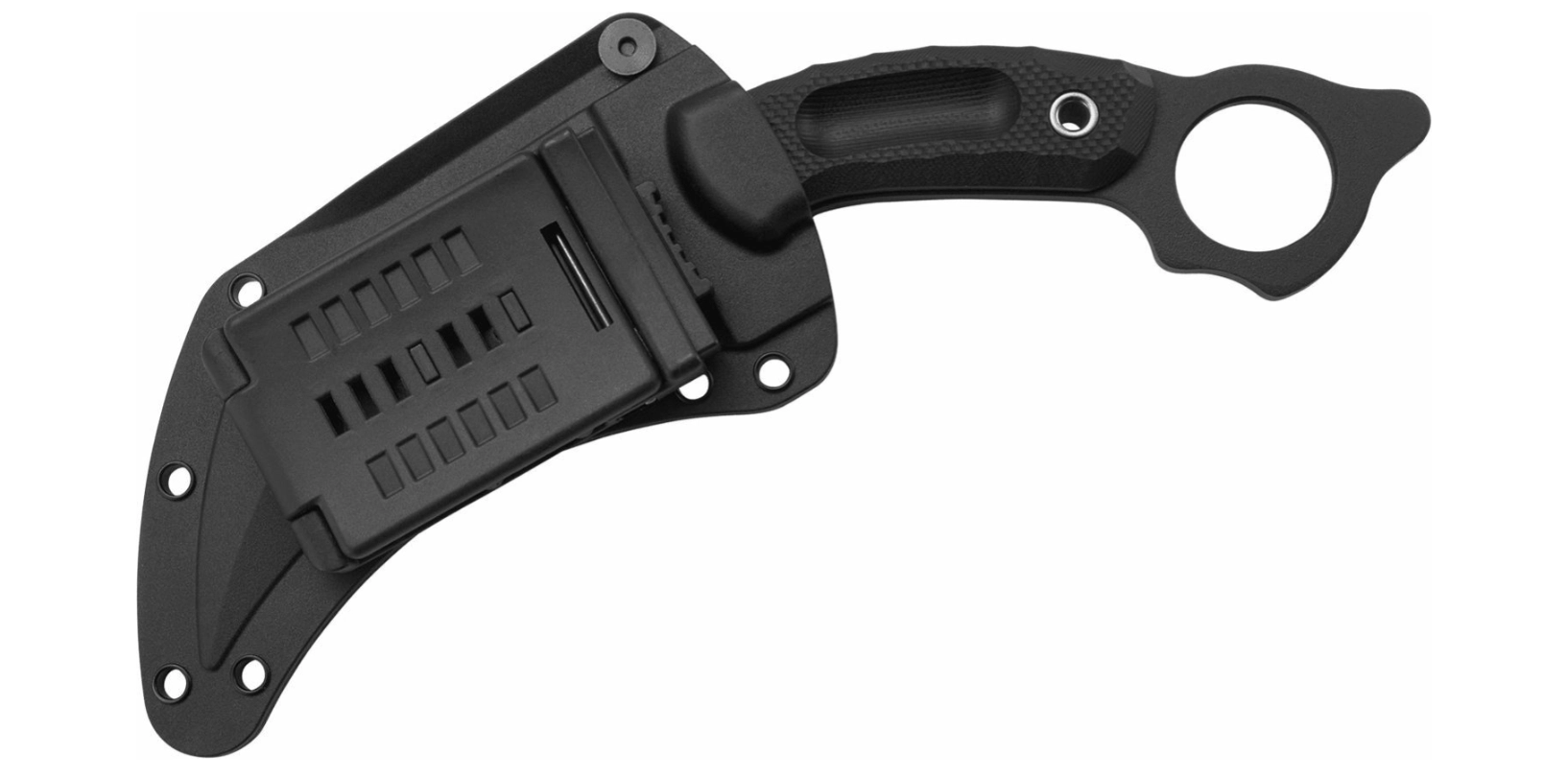 De volledig doorlopende full-tang constructie in combinatie met duurzame G10-schalen zorgt voor een stevige en zekere grip. De grote vingerring aan het einde van de handgreep verbetert de retentie en wendbaarheid bij tactische greepwissels. Inbegrepen is een lichte en robuuste GRN-schede voor veilige opslag en snel trekken.