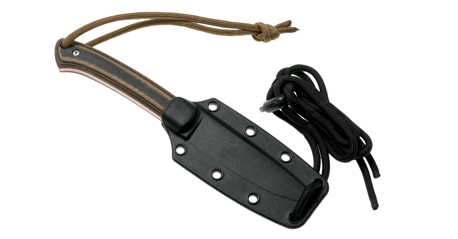 De handgreep van gelaagd G10 in bruin‑zwart ligt uitstekend in de hand, is bestand tegen vocht en biedt een zekere grip. Het koordoog maakt het mogelijk een koord te bevestigen of het trekken te verbeteren. In de verpakking zit een lichte kunststof schede die je aan de riem kunt dragen of om de hals kunt hangen – ideaal voor snelle en veilige toegang.