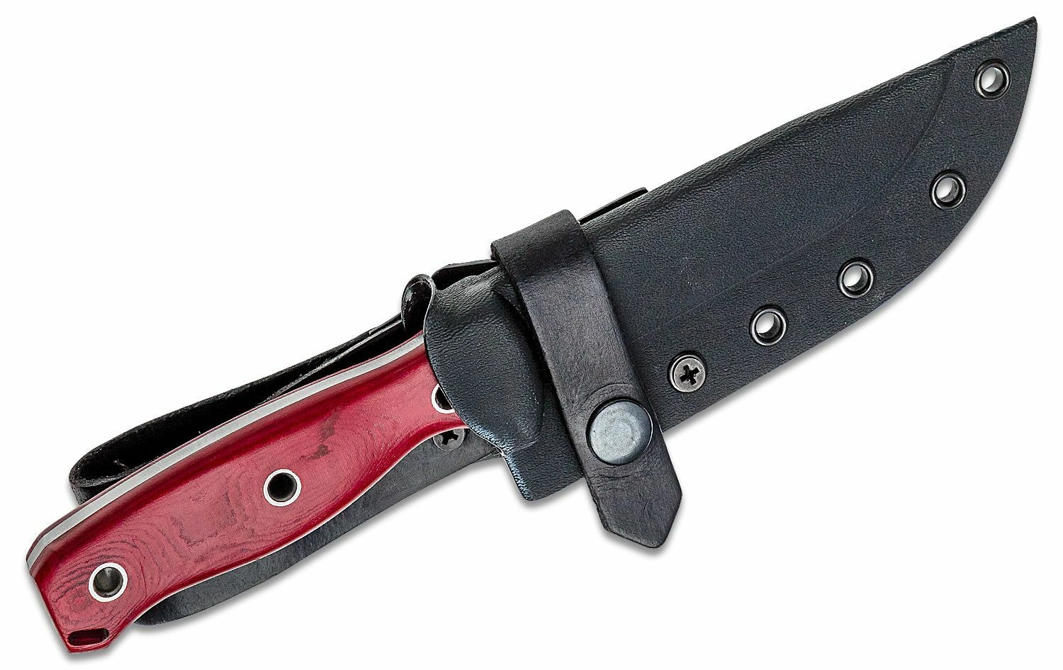 Het 3D-gefreesde rode Micarta-handvat is stevig bevestigd met drie holle klinknagels en biedt uitstekende tractie, ook in natte omstandigheden. Uitgesproken duimsteunen op de rug van het handvat geven zekerheid bij fijn, gedetailleerd werk. Inbegrepen is een duurzaam Kydex-foedraal, aangevuld met lederen elementen voor comfortabel en veilig dragen in het veld.