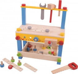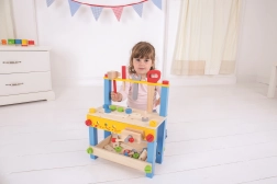 Ontdek de eerste werkplaats voor kleine doe-het-zelvers – een robuuste houten werkbank met 26 onderdelen die de fijne motoriek, oog-handcoördinatie en creatief spel stimuleert. Inclusief kindergereedschap zoals een hamer, zaag, sleutel, schroevendraaier, schroeven en moeren. Gemaakt van hoogwaardig hout en voldoet aan de Europese veiligheidsnormen.
