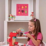 Plaats houten capsules in de hendel, “schenk” koffie in het kopje en speel de rol van een echte barista. Interactieve elementen stimuleren de verbeelding en de fijne motoriek.