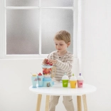 Deze stijlvolle houten set uit de Honeybake-collectie verandert elke kinderkeuken in een smoothiebar. Kinderen kunnen veilig fruit “snijden” met klittenband, de blenderkan vullen en heerlijke drankjes serveren in twee bekers met rietje. De realistische details stimuleren rollenspel, ontwikkeling van de fijne motoriek en cognitieve vaardigheden.
