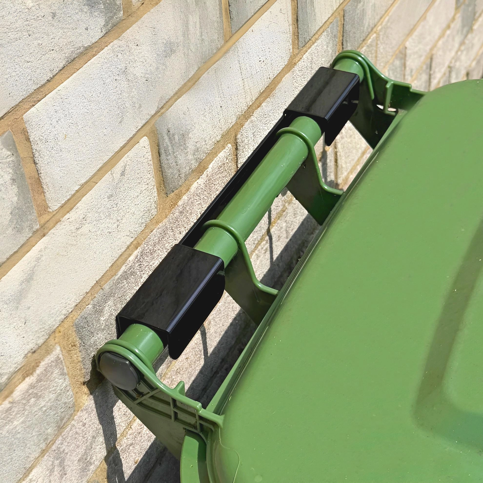 De houder is ontworpen voor snelle en eenvoudige montage en universeel gebruik met gangbare containers van 120–240 liter. Dankzij de compacte afmetingen is hij niet hinderlijk, maar voorkomt hij effectief omvallen, verschuiven en klapperende deksels bij wind.