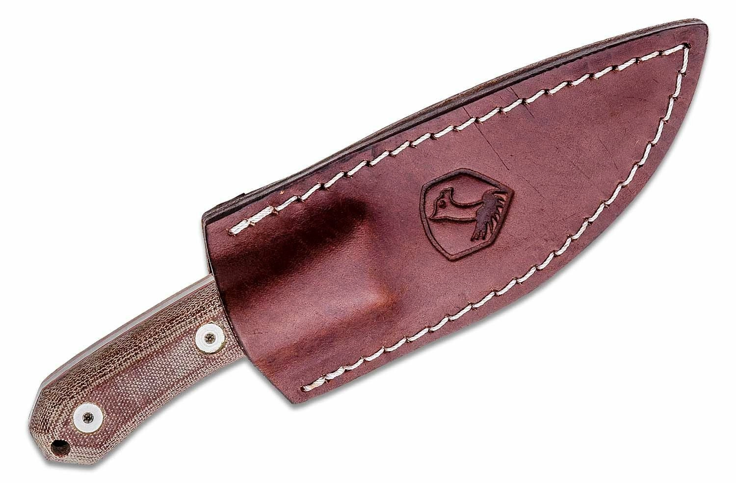De ergonomische Micarta handgreep in de bruine tint Tan heeft een ruigere textuur voor een zekere grip in zowel droge als vochtige omstandigheden. Het koordoog vergroot de mogelijkheden voor zekeren of ophangen. De verpakking bevat een kwalitatieve leren schede voor veilig en comfortabel dragen aan de riem.