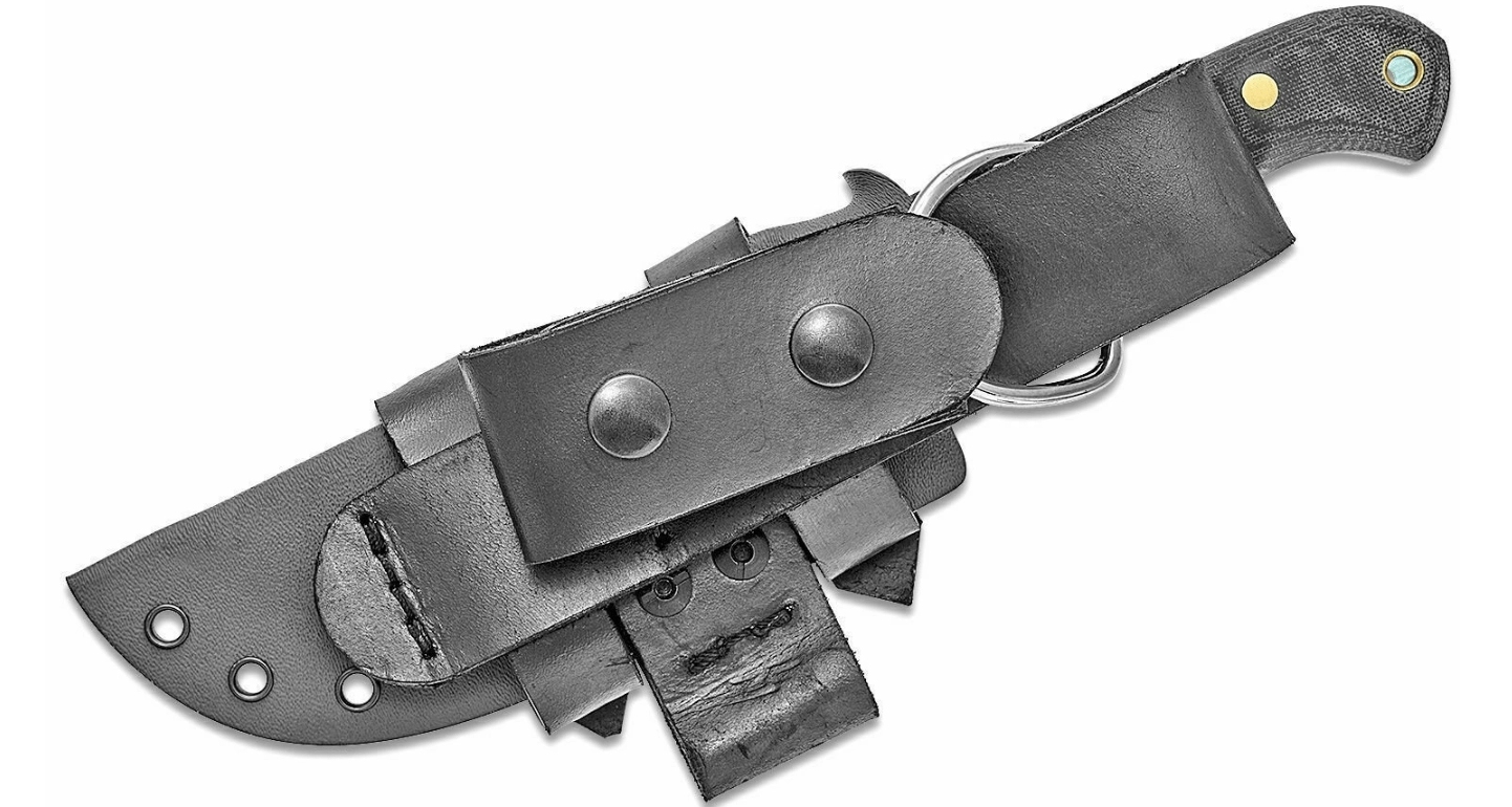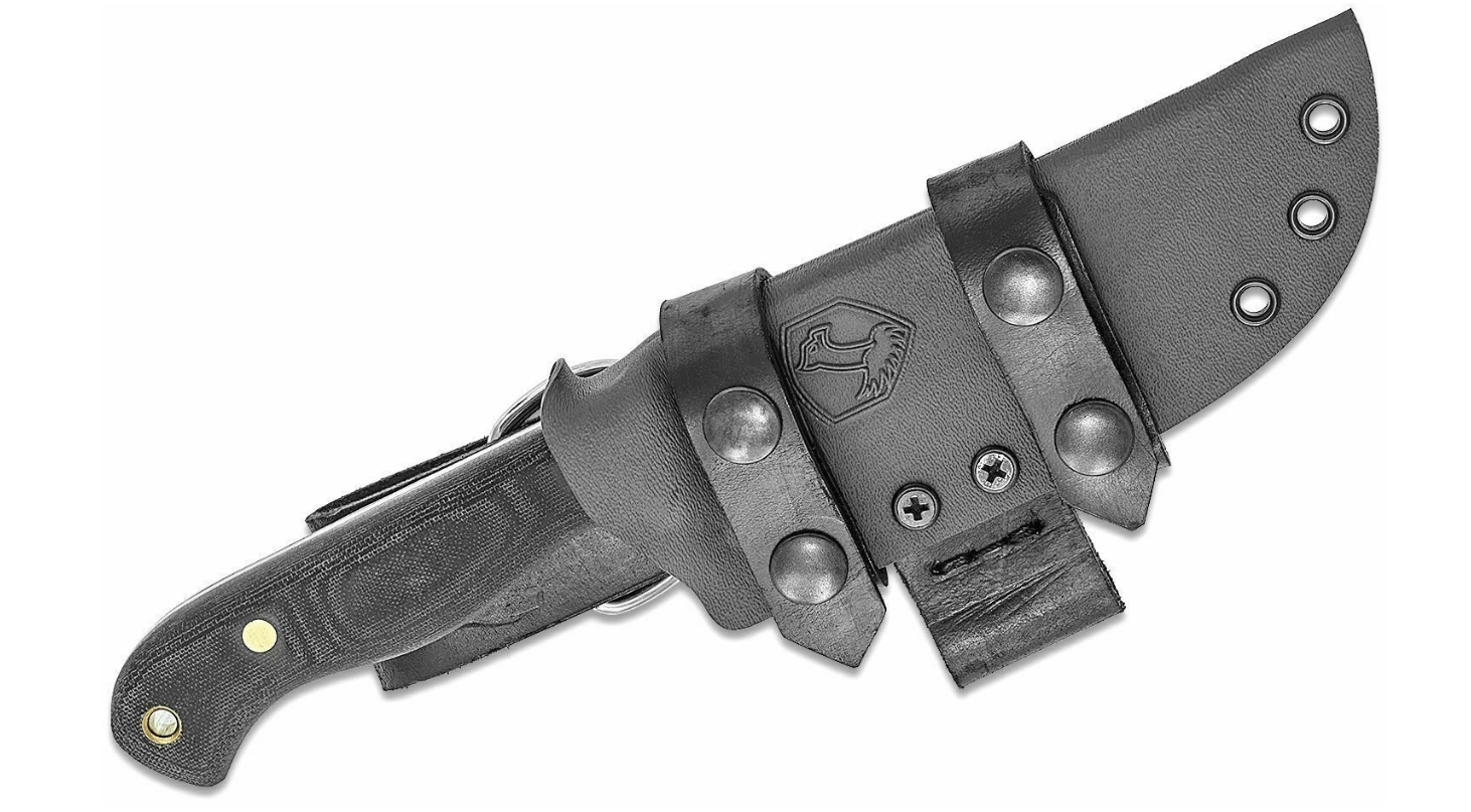 Inclusief een duurzame kydex schede met leren lussen, die meerdere draagwijzen mogelijk maakt – verticaal aan de rechterzijde, horizontaal en na een kleine aanpassing ook aan de linkerkant. Zo is het mes altijd veilig opgeborgen en klaar voor gebruik.