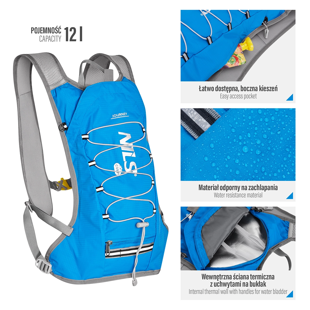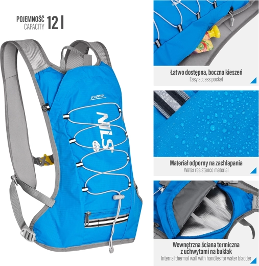 De NILS Camp Journey is een compacte rugzak van 12 liter van duurzaam nylon en polyester, die uitblinkt door een laag gewicht en weerstand tegen slijtage en spatwater. Het hoofdvak is voorzien van aluminiumfolie voor thermische isolatie van het hydrovak en twee klittenbandstroken om het op te hangen. De slang kan aan beide kanten onder de schouderpanelen worden uitgevoerd – zo is hydratatie altijd binnen handbereik.