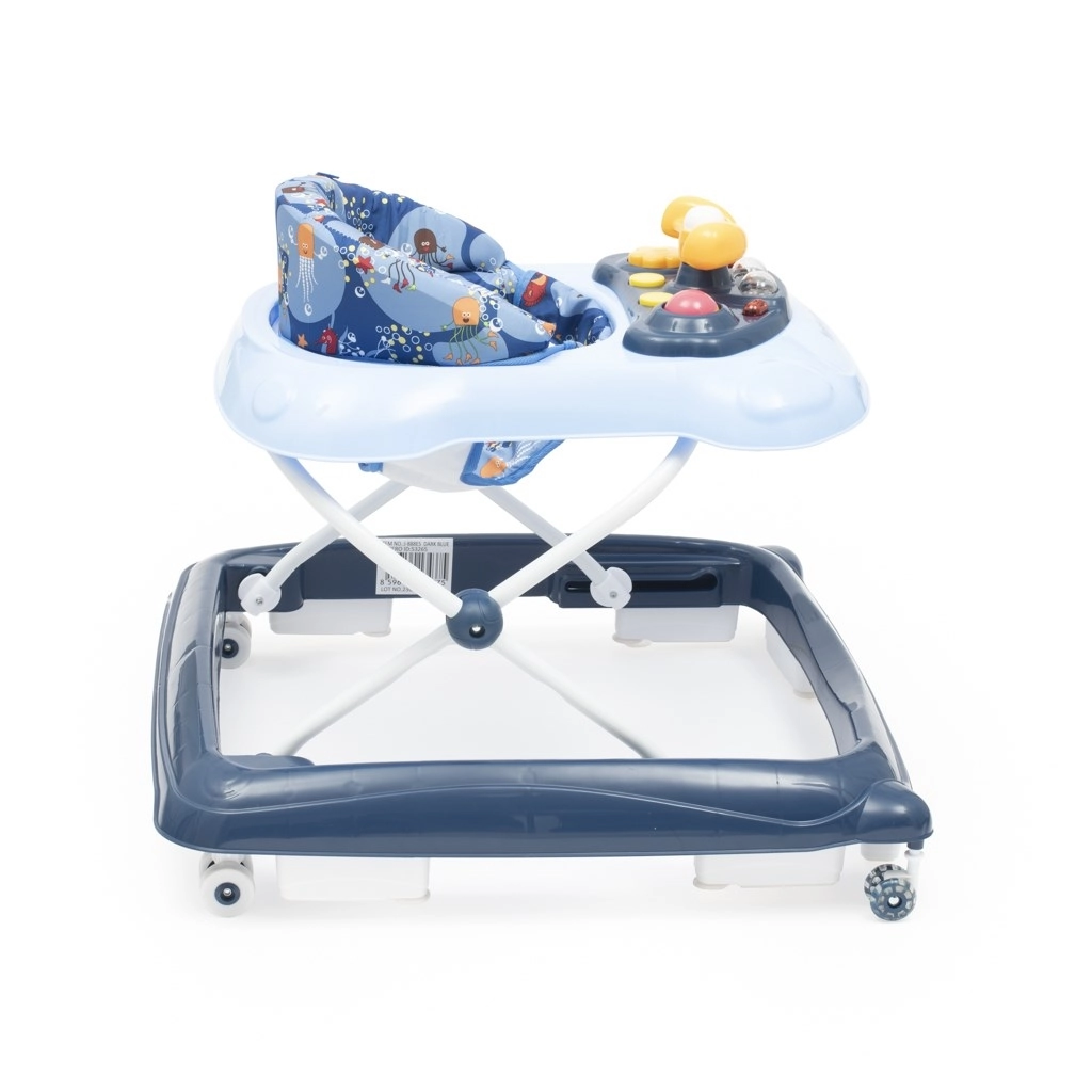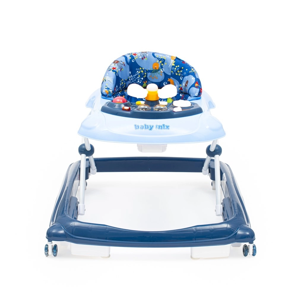 De praktische en leuke babyloopstoel BABY MIX in donkerblauw ondersteunt de eerste stapjes en de coördinatie. Hij biedt een multimediapaneel met licht en geluid, een draaibaar stuur met claxon, 3 hoogte­standen en siliconen wielen die de vloer sparen. Voor de veiligheid is er een speciaal kantelbeveiligingssysteem en een stabiele brede basis.