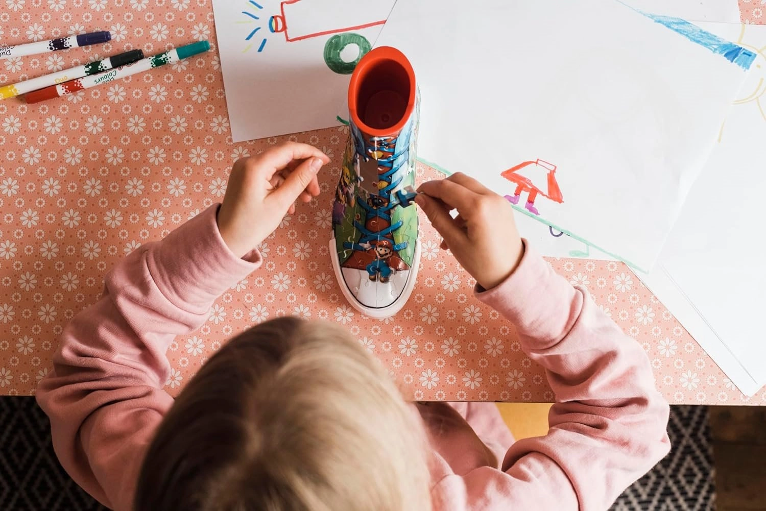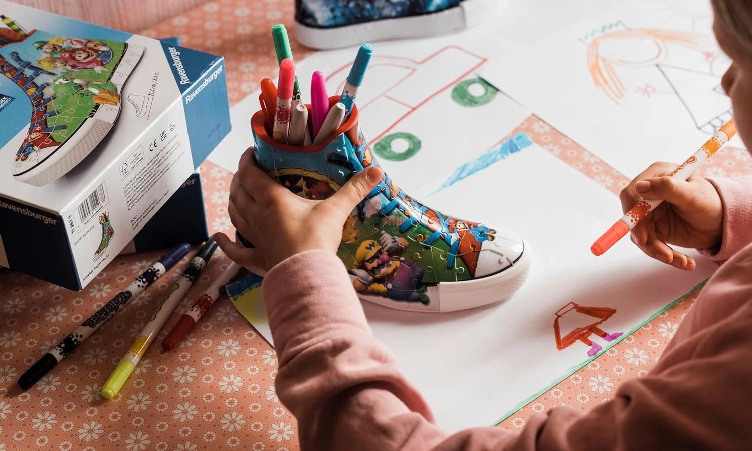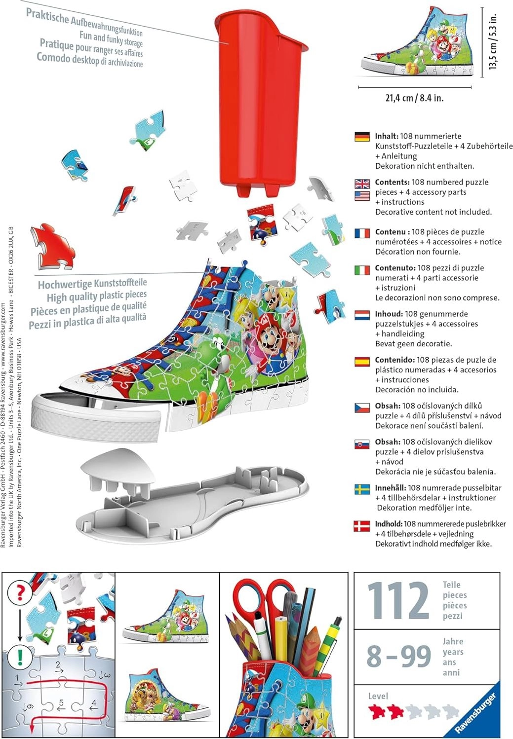Maak van 108 kunststof puzzelstukjes deze klassieke sneaker met Super Mario-motief en creëer de perfecte kamerdecoratie! Na het in elkaar zetten wacht je nog een bonus: je kunt hem gebruiken voor kwasten, potloden, enz.