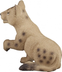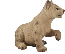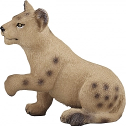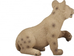 Het figuur toont een leeuwenwelp in een natuurlijke pose met een fijne vachttextuur en authentieke vlekjes, typisch voor jongen.
