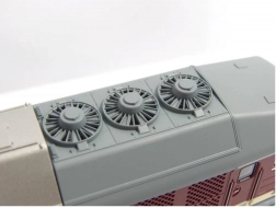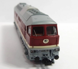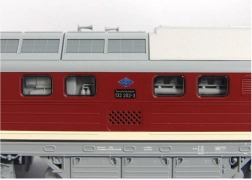 Getrouwe en gedetailleerde modelweergave van de dieselelektrische locomotief BR 132 „Ludmilla“ in DR-uitvoering. Opvallend zijn vooral de details die afwijken van andere varianten, zoals de handgrepen aan de frontzijde, de details van de front- en zijruiten en de uitvoering van het dak. De kleurstelling en bedrukking, inclusief alle decoratieve elementen, zijn van topkwaliteit, passend bij de Expert-productlijn. Het model is uitgerust met een krachtige motor met vliegwielen; het koppel wordt via diagonaal geplaatste, gebandeerde wielen op de binnenste assen van het draaistel overgebracht, waarbij vier assen worden aangedreven. In combinatie met het lange zinkdrukgietframe levert dit uitstekende rijeigenschappen op. Wit/rood LED-frontsein wisselt met de rijrichting en ook de machinistencabine is verlicht. Het model kan worden uitgebreid met een speciaal daarvoor bestemde digitale decoder met soundmodule en luidspreker. Er zijn ook passende rijtuigen/wagons van het juiste type en in bijpassende uitvoering verkrijgbaar. Belangrijkste kenmerken: zes assen motor met twee vliegwielen twee gebandeerde aangedreven wielen verlichting met kleurwissel volgens rijrichting interieurverlichting PluX22-interface volgens NEM 658 NEM 362-koppelschacht met kortkoppelingkinematica Documentatie: Brochure voor modellen BR 132/BR 232 (DE) Algemene informatie over BR 130 (DE, EN, F, NL) Testrapport van het model in Miniaturbahnen 2/2018 (DE) Handleiding en onderdelenlijst model nr. 52760 (DE, EN, F, NL)