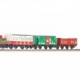 Bonte feesttrein met stoomlocomotief, rijtuig en twee goederenwagens. Alles wat u nodig hebt om direct na het uitpakken te rijden.