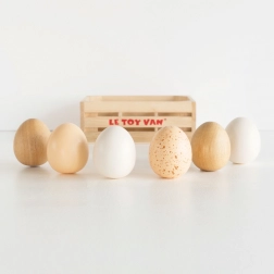 Houten boerderij-eieren in een kistje van LE TOY VAN zijn de perfecte aanvulling voor de kinderkeuken en het winkeltje. De set van 6 realistische eieren van stevig rubberhout in een praktisch kistje met handgrepen stimuleert fantasiespel, ontwikkelt de fijne motoriek en leert kinderen over gezonde voeding. Gemaakt van duurzame materialen en beschilderd met niet-giftige verf op waterbasis.