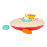 Een vrolijke pelikaan in een kano van het merk SMALL FOOT beweegt dankzij het opwindmechanisme vanzelf over het wateroppervlak. De combinatie van hout en hoogwaardige kunststof zorgt voor duurzaamheid en een lange levensduur. Ideaal voor in bad en bij het zwembad, en het bevordert de fijne motoriek en het begrip van oorzaak en gevolg.